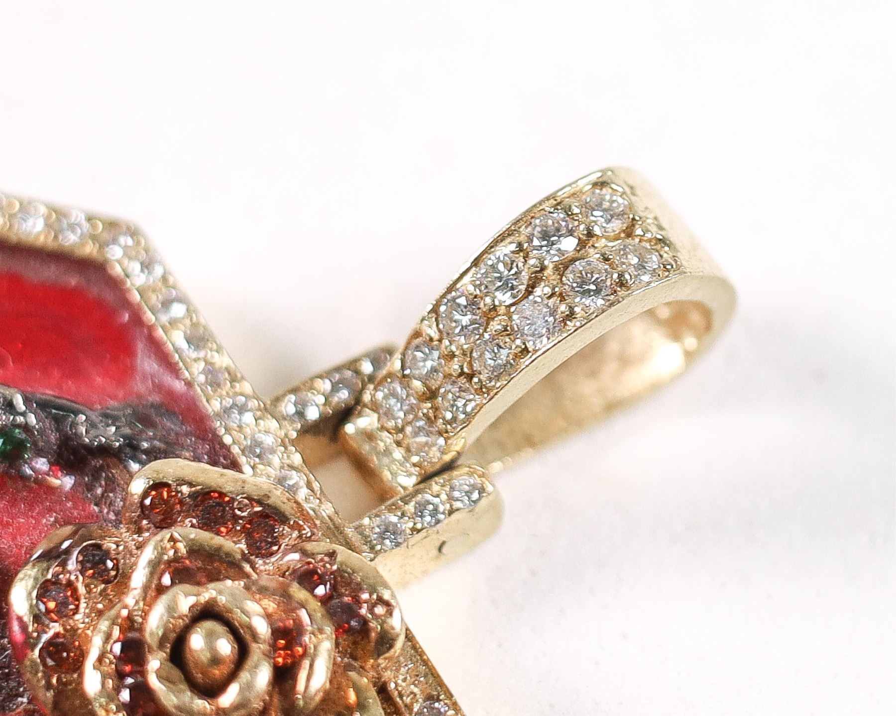 10K yellow gold superman flower pendant set with .80 ctw multi color diamonds and red enamel. Weight 11.2 grams.