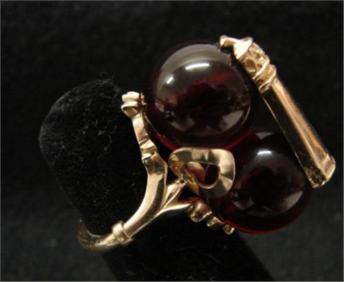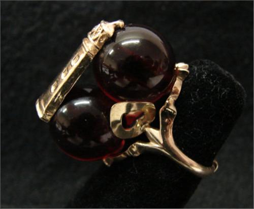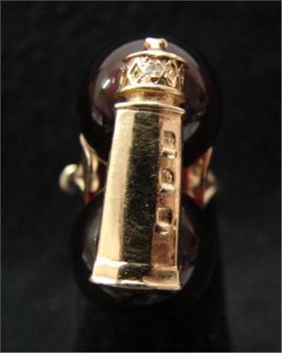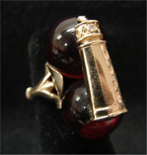 YELLOW GOLD & AMBER RING. Has 14KT yellow gold lighthouse mounted on two amber balls with one 1.25mm diamond.