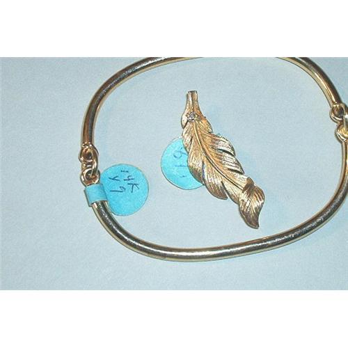 <table width="100%" border="0" cellspacing="0" cellpadding="4"><tr><td><em> </em></td></tr><tr> <td width="100%"> YELLOW GOLD BRACELET/PIN NEW MIB/14K This is a brand new item from an estate sale from a collector in its original jeweler's box and tagged 14kyg together with the price tag. The bracelet measures approximately 5 inches and is wrist shape when closed. It is plain and elegant. The 1 1/4 inch pin has a leaf design and a tiny diamond/I believe it has a hallmark on the back but I cannot read it. These exquisite items would make a great holiday gift for that special person. </td></tr><tr> <td> </td></tr><tr> <td>Reference #: 3010a</td></tr><tr><td>Condition:mint</td></tr><tr><td>Year:1970's</td></tr><tr><td>Title:YELLOW GOLD BRACELET/PIN NEW MIB/14K</td></tr><tr><td>Location:CENTRAL NEW YORK </td></tr></table>