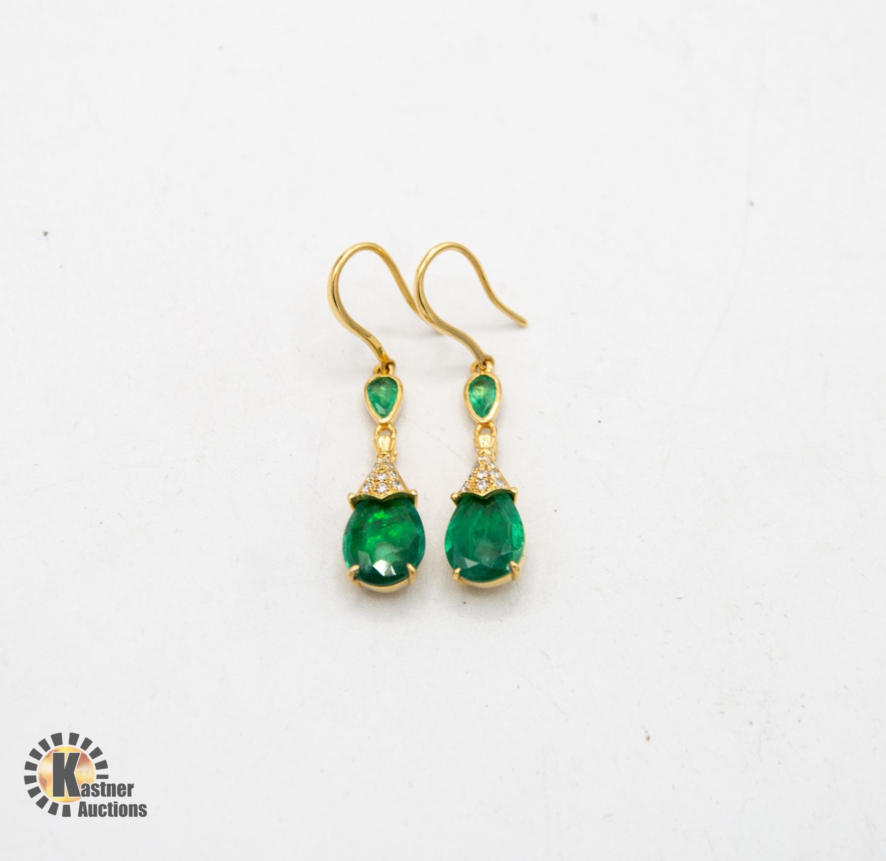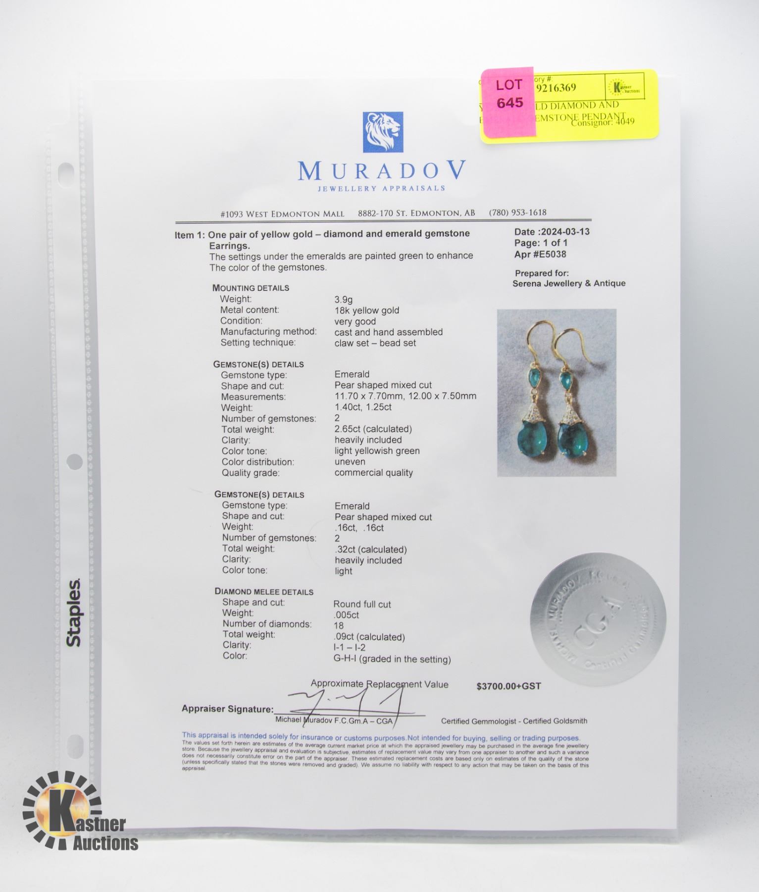 18K YELLOW GOLD, CLAW SET - BEAD SET, EMERALD PEAR SHAPED MIXED CUT MEASURING 11.70 X 7.70MM, 12.00 X 7.50MM, WEIGHT 1.40CT & 1.25CT. HEAVILY INCLUDED, LIGHT YELLOWISH GREEN, UNEVEN COLOR DISTRIBUTION, DIAMONDS ARE ROUND FULL CUT MEASURING 0.005 CT, TOTAL NUMBER OF DIAMONDS IOS 18. CLARITY I-1 AND 1-2, COLOR G-H-I. COMES WITH APPRAISAL FROM MURADOV, APPROXIMATE REPLACEMENT VALUE $3700 **ALL ITEMS MUST BE REMOVED BY 5PM SATURDAY, APRIL 27TH 2024. ALL REMAINING ITEMS WILL BE SUBJECT TO A $6.00 PER DAY STORAGE CHARGE. ANY ITEMS REMAINING AFTER MONDAY, MAY 10TH 2024 WILL BE CONSIDERED FORFEITED. NO REFUNDS WILL BE ISSUED FOR FORFEITED ITEMS. TO SCHEDULE A PICK UP APPOINTMENT CLICK HERE