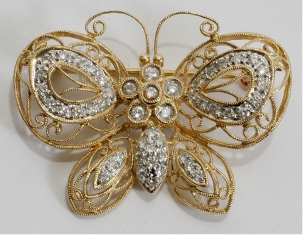 YELLOW GOLD FILIGREE & DIAMOND BUTTERFLY PIN, L 1":Set with round cut diamonds totaling approximately .71ct. Weighs approximately 7.6 grams.