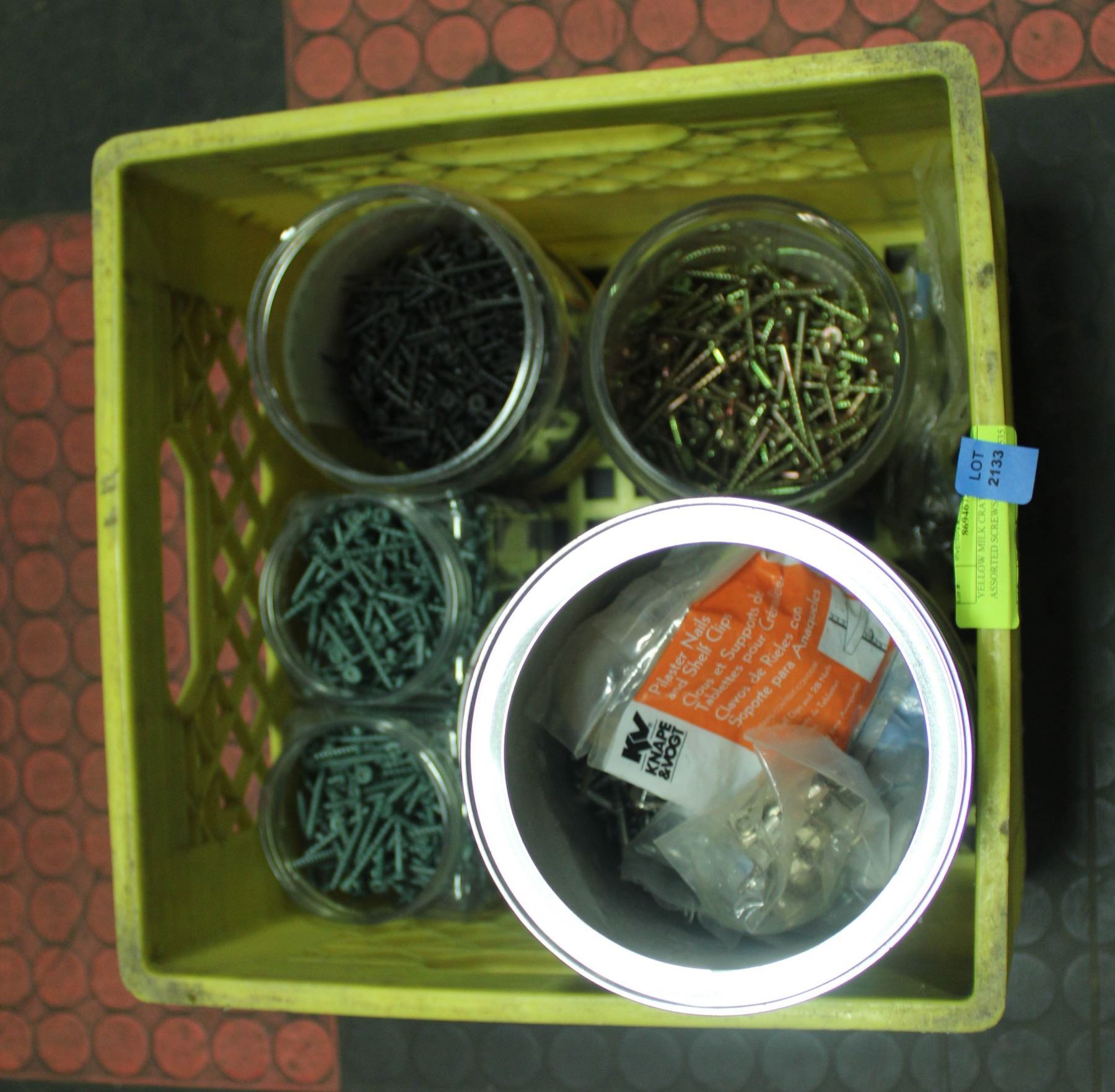 YELLOW MILK CRATE WITH ASSORTED SCREWS, NAILS,