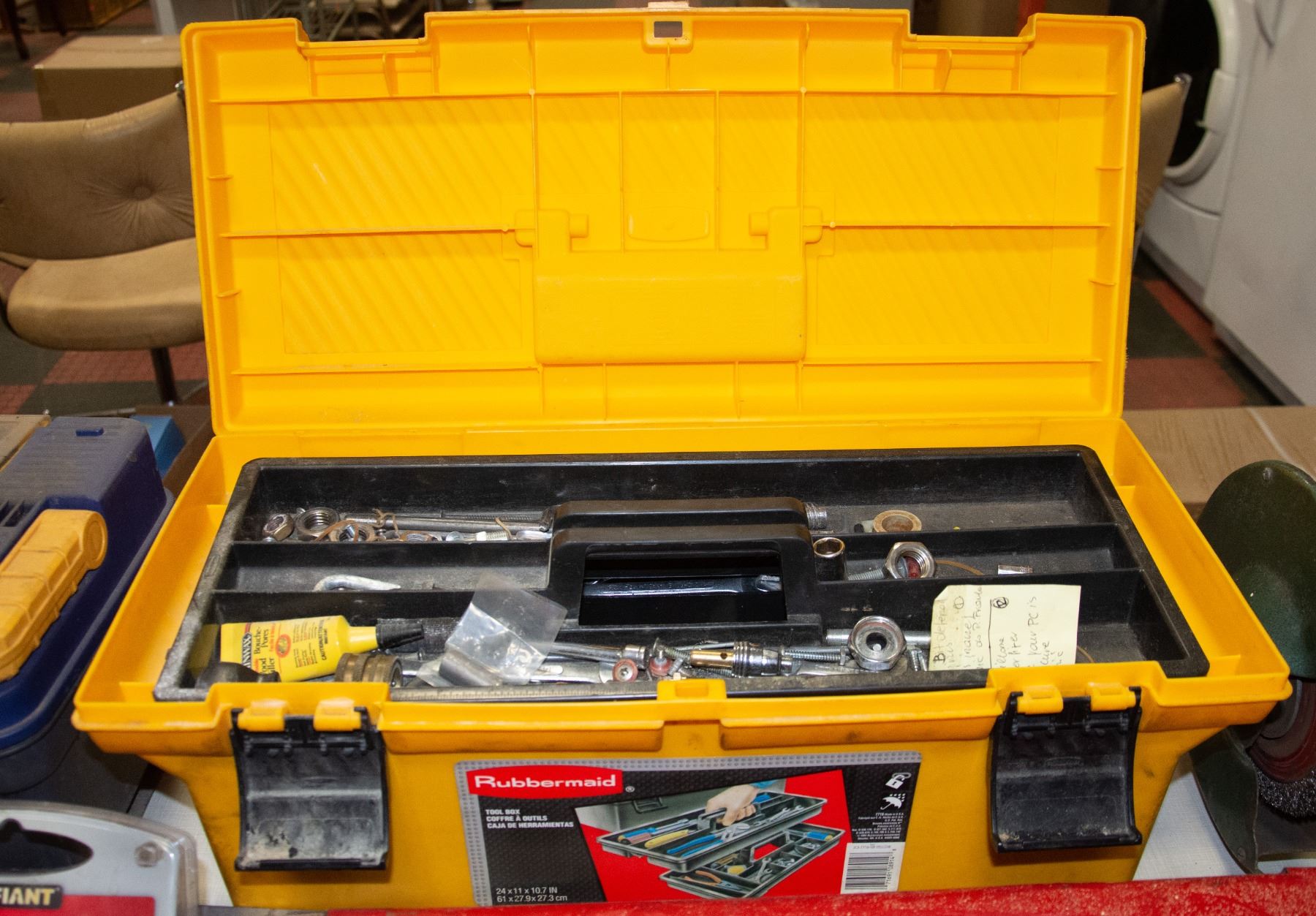 YELLOW RUBBERMAID TOOLBOX WITH CONTENTS