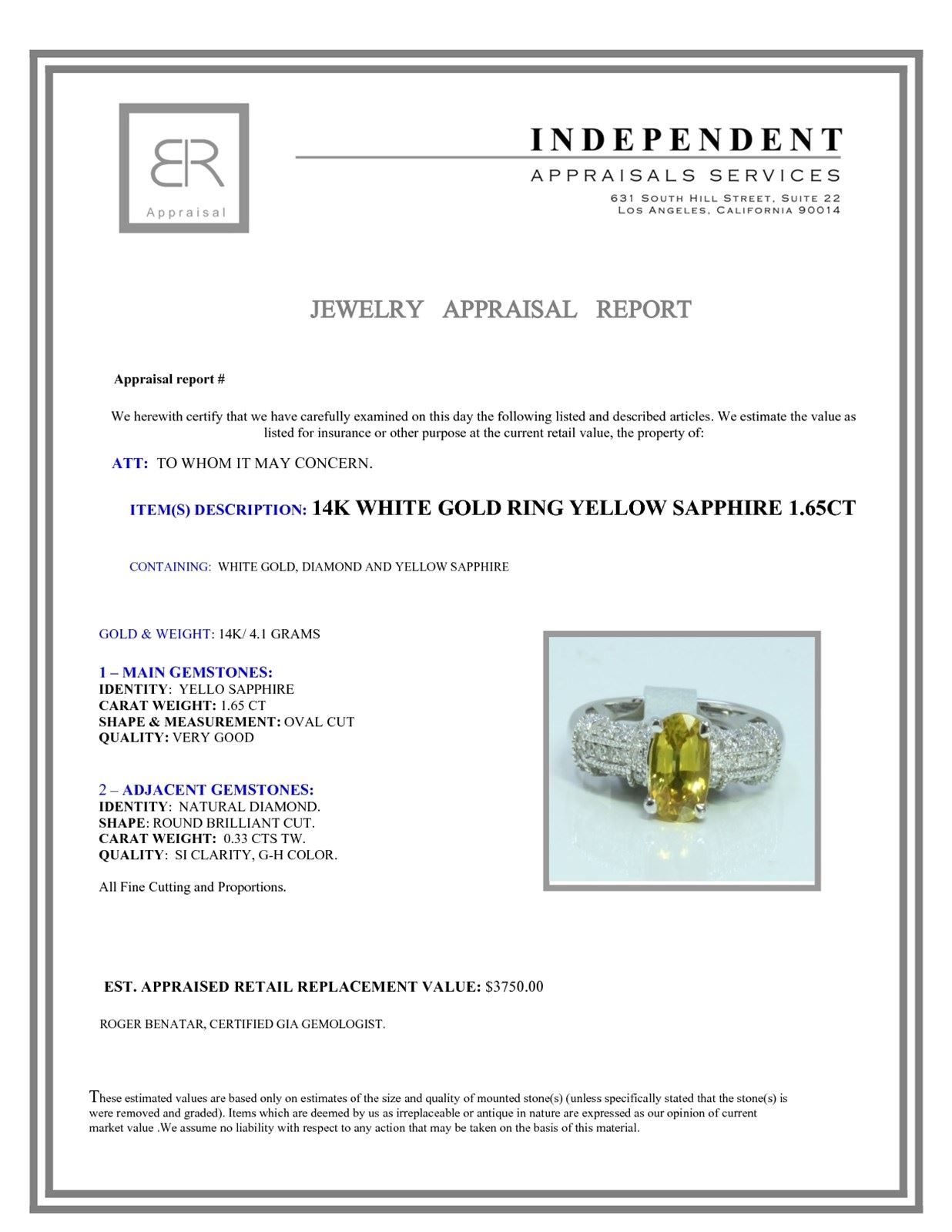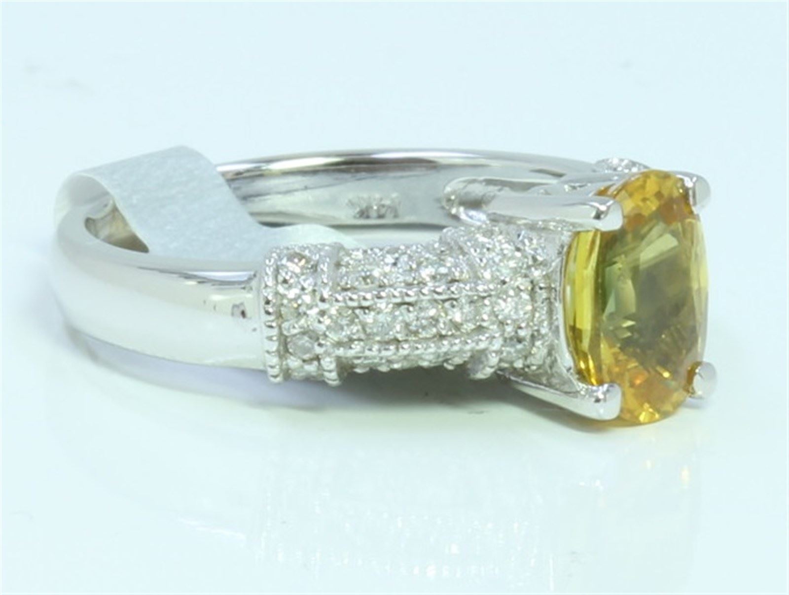 14K WHITE GOLD RING 4.1 GRAM DIAMOND 0.33CT YELLOW SAPPHIRE 1.65CT