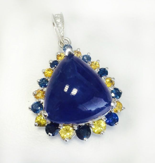 YELLOW SAPPHIRE 1.76CT / BLUE SAPPHIRE 2.20CT / TANZANITE CAB 34.67CT, 14K W/G PENDANT 8.74GRAM / DI