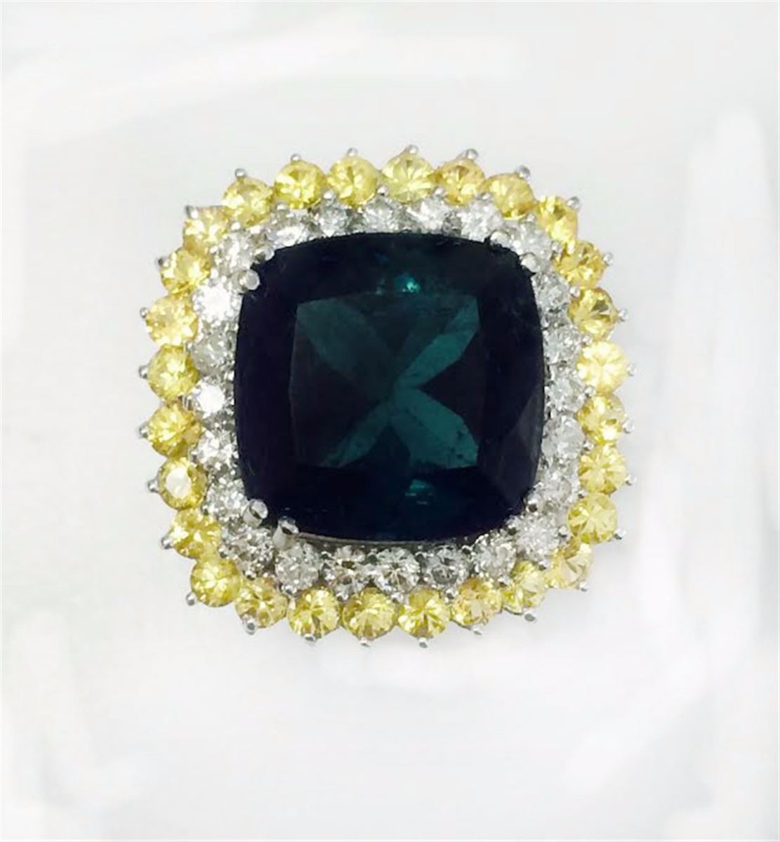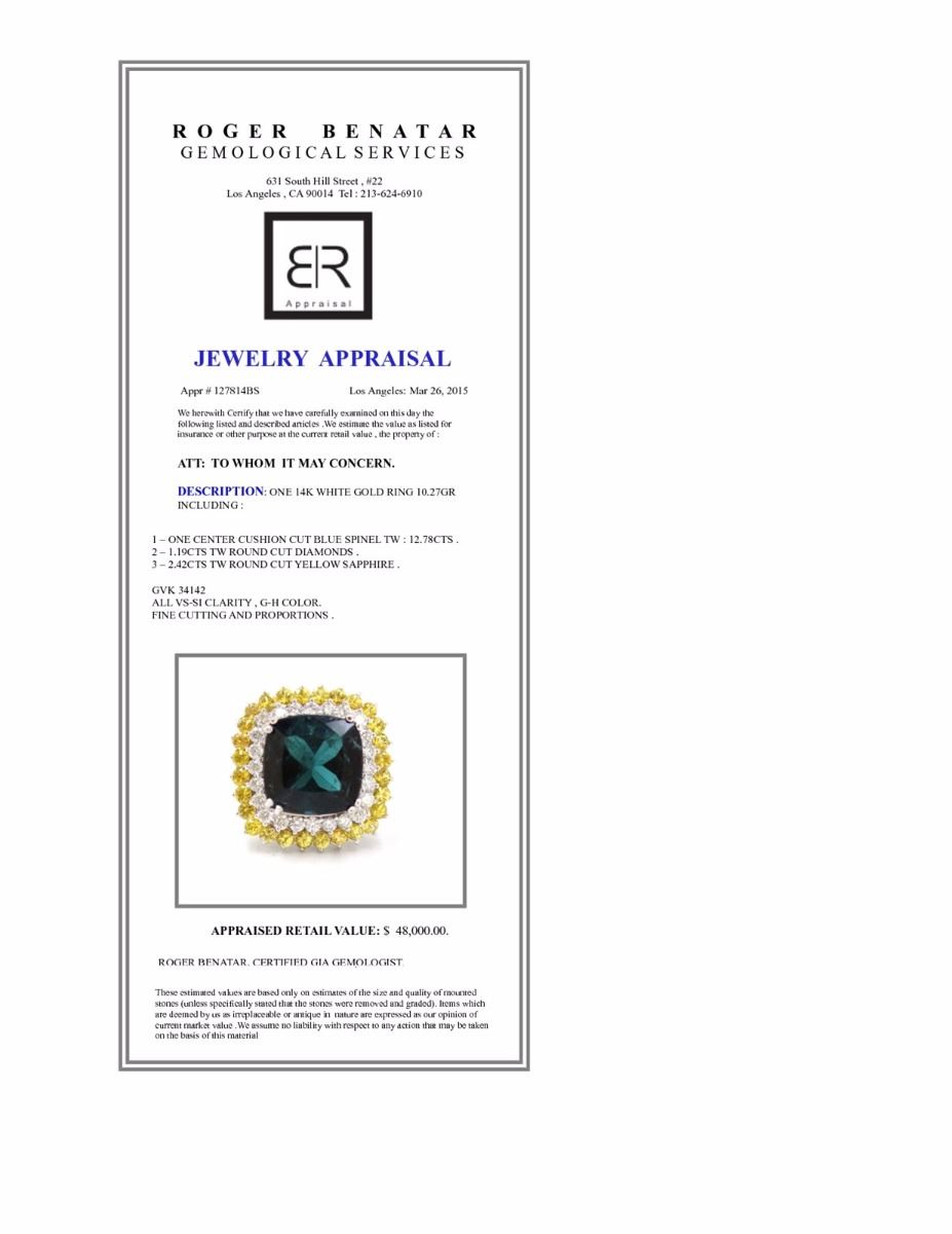 YELLOW SAPPHIRE 2.40CT / BLUE SPINEL 12.78CT, 14K W/G RING 10.27GRAM / DIAMOND RD 1.19CT