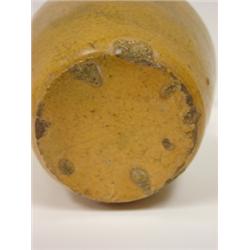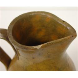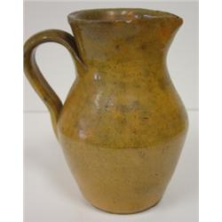 Yellow southern art pottery handled pitcher. Has chip on body, several chips around bottom of base and one chip on outer rim. 6" H