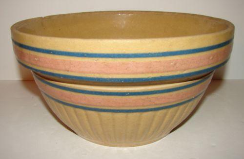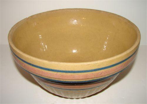YELLOWARE BANDED BOWL. Pink band between two small blue band decoration at two areas on body. Shows crazing throughout. Shows a small amount of chipping around outer rim. Shows one tight hairline crack at bottom of interior of bowl. Shows some spider cracking at bottom of base. 4.75” H, 9.25” Dia.