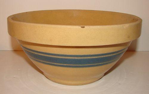 YELLOWARE BLUE BANDED BOWL. Triple blue band decoration around body. Shows crazing throughout. Shows three small chips around outer rim. 3.75" H, 8" Dia.