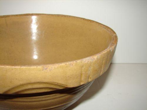 YELLOWARE BOWL. Triple white banded decoration around body. Marked on bottom “Oven Ware/Made in U.S.A./8”. Shows crazing throughout. Top rim shows major chipping. Shows two tight vertical hairline cracks. 4.5” H, 8.5” Dia.
