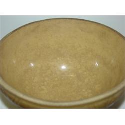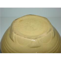 YELLOWARE MIXING BOWL. Blue and white bands decorated around body. Staining and crazing is visible to interior. 4.25" H, 7.5" Dia.