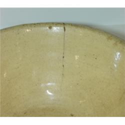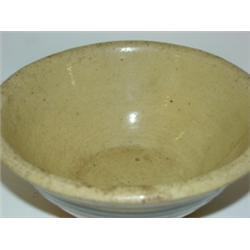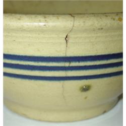 YELLOWARE MIXING BOWL. Blue bands decorated around body. Crazing and staining is visible to interior and exterior. Hairline crack from top edge of bowl measures 2.75" L. 3" H, 7" Dia.