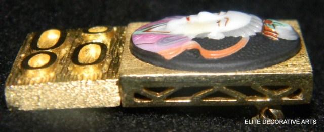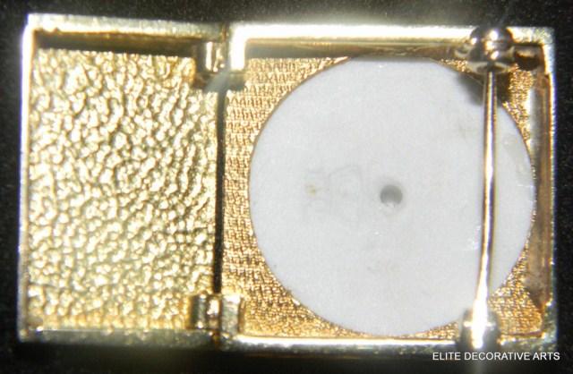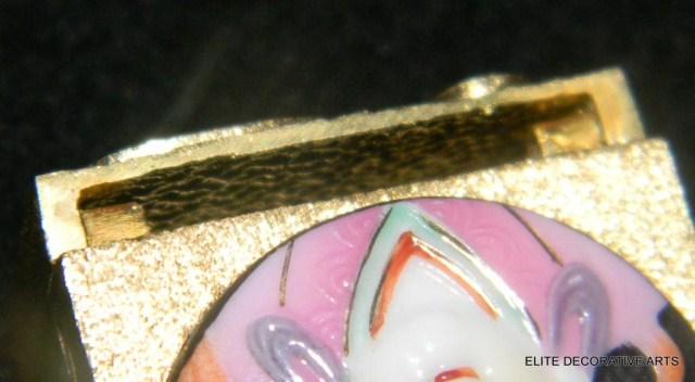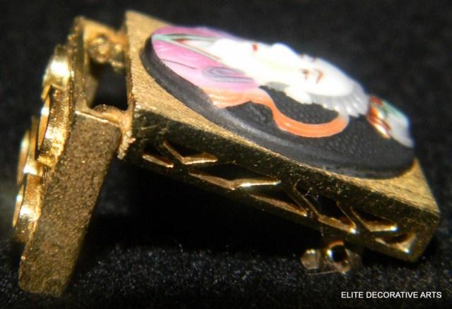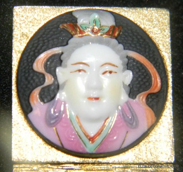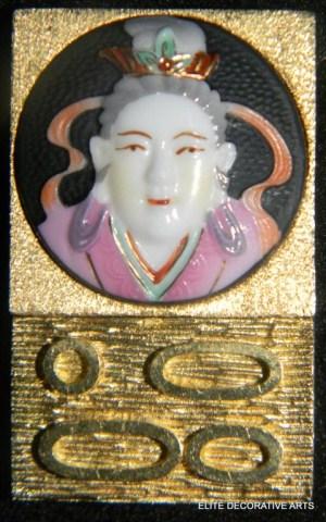 Yellow Gold Oriental Lady Pin, hand painted enamel face with hinged bottom. Pin measures 1".