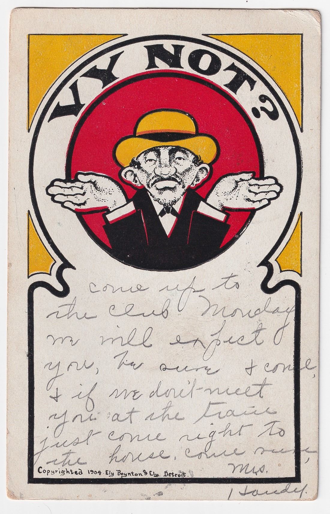 American early 20th-century Yiddish postcard asking 'Vy Not?' Copyright 1904, Ely Boynton & Ely, Detroit. Postally used, 5.5 x 3.5 inches, cancelled Ohio 1906.