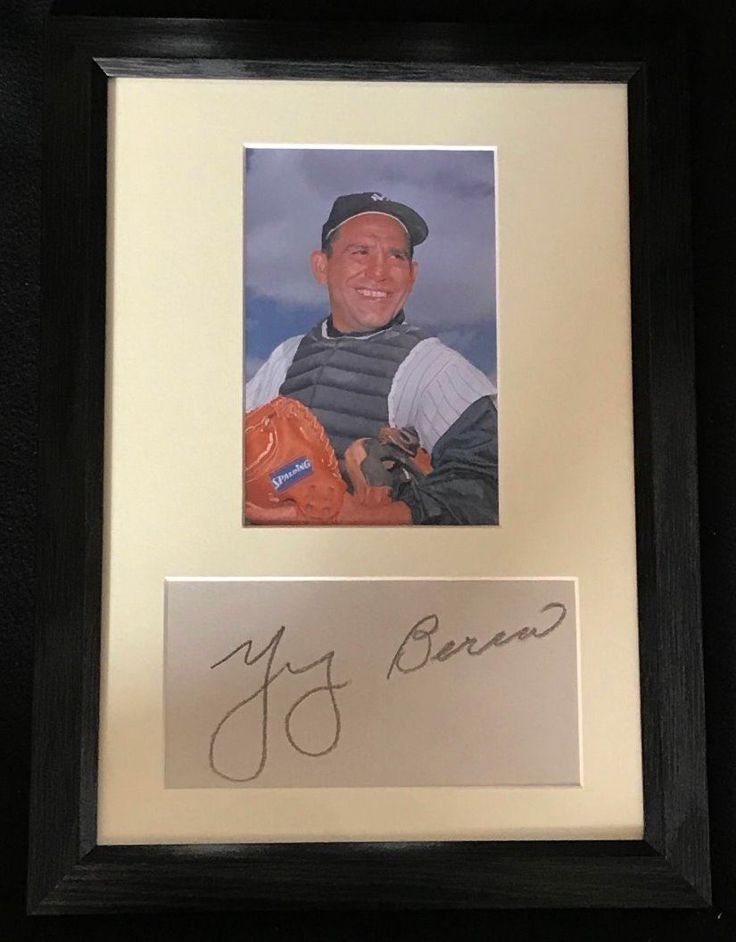 Lawrence Peter "Yogi" Berra was an American professional baseball catcher, who later took on the roles of manager and coach. He played 19 seasons in Major League Baseball, all but the last for the New York Yankees. Autograph mounted and framed.