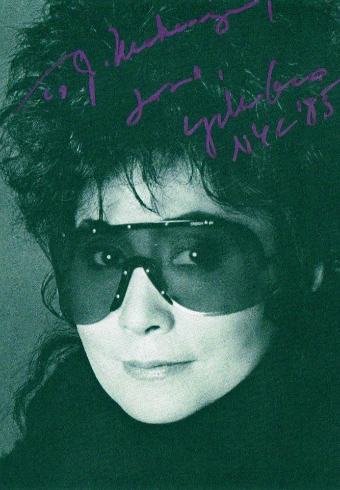 A small photo signed and inscribed by Yoko Ono in 1985.