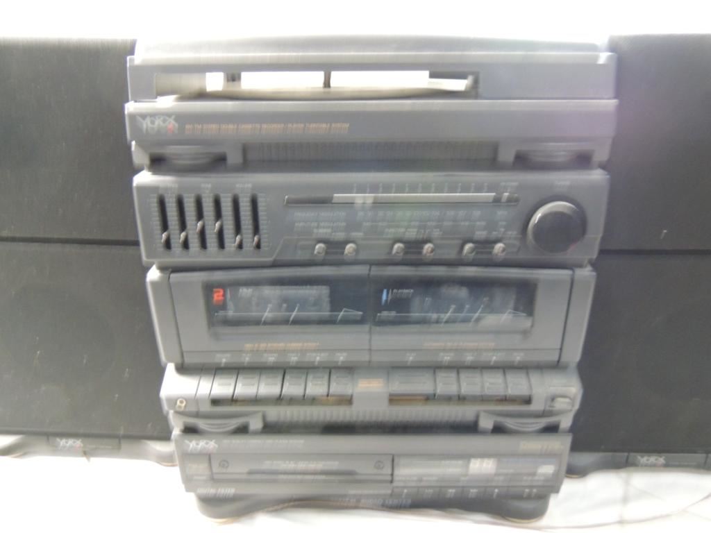 YORX STERO BOOKSHELF STEREO DOUBLE CASSETTE RECORDER/ PLAYER TURNTABLE SYSTEM AM/FM STEREO TABLE TOP STEREO WITH SPEAKERS AS SHOWN SEE PHOTO FOR MORE DETAILS