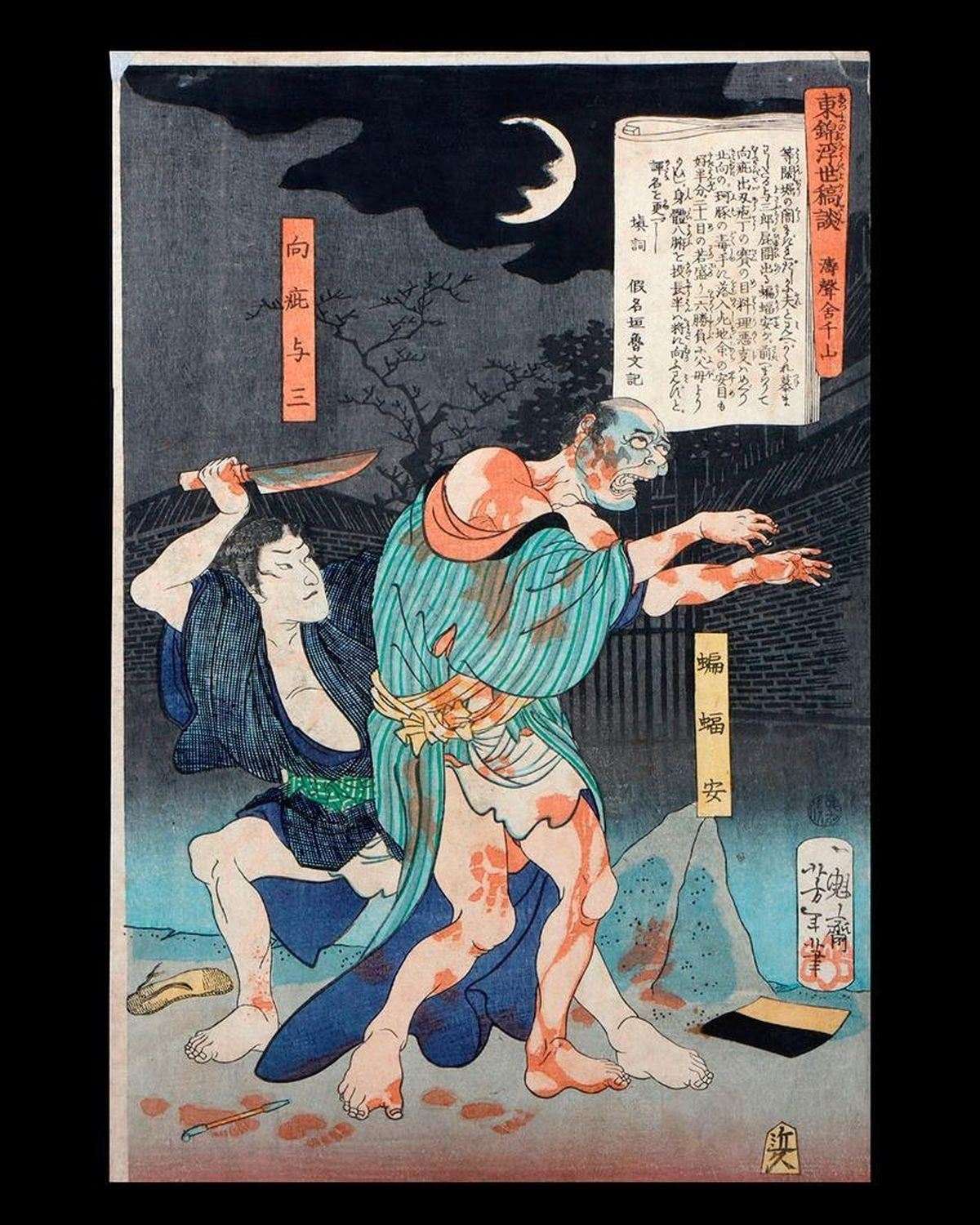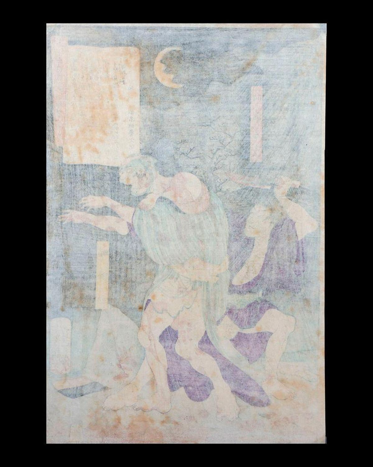 Tsukioka Kinzaburo YOSHITOSHI (1839-1892) Series : Komori Yasuand Mukokizu Yosa, from the series Tales of the Floating World in Eastern Brocade. Date : (c.1867) Medium: Woodblock Dimensions : 14 1/2 x 9 3/4in. Condition : overall good, backed, faded, small holes, and small repairs to top corners, trimmed.