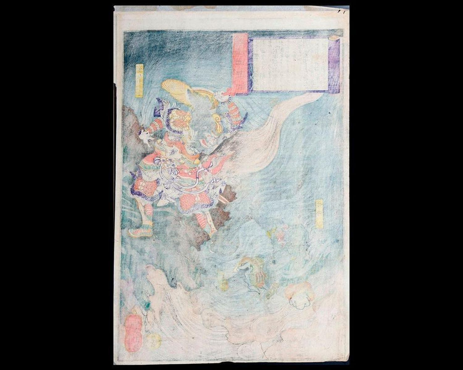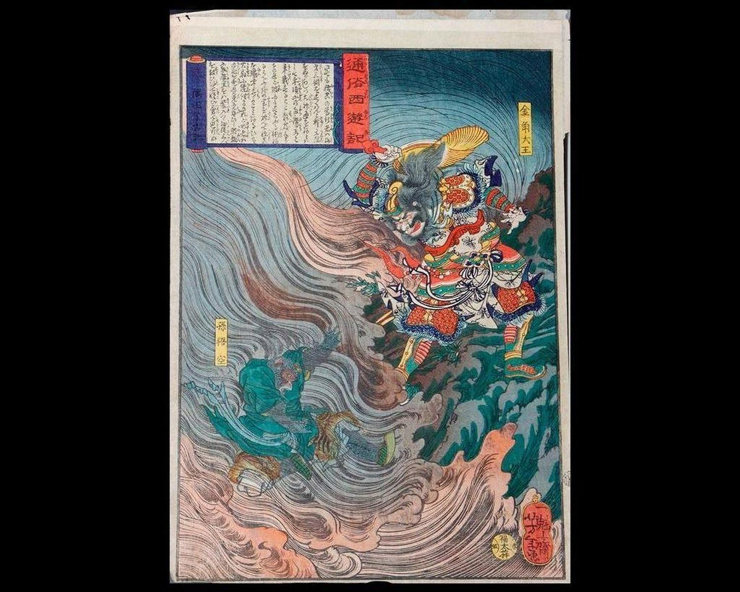 Artist : Tsukioka Kinzaburo YOSHITOSHI (1839-1892) Series : The Journey to the West, A Popular Version ( Tsuzoku saiyuki ) Date : (c.1864/65) Medium: Woodblock Dimensions : 14 x 9 1/2 in. Condition : Overall good, some small holes near the edges