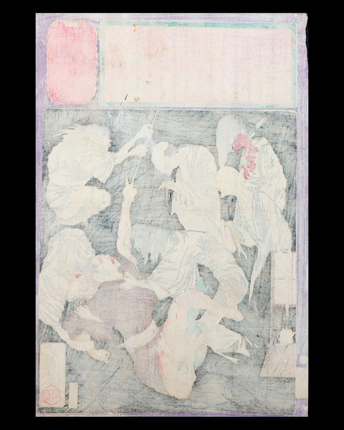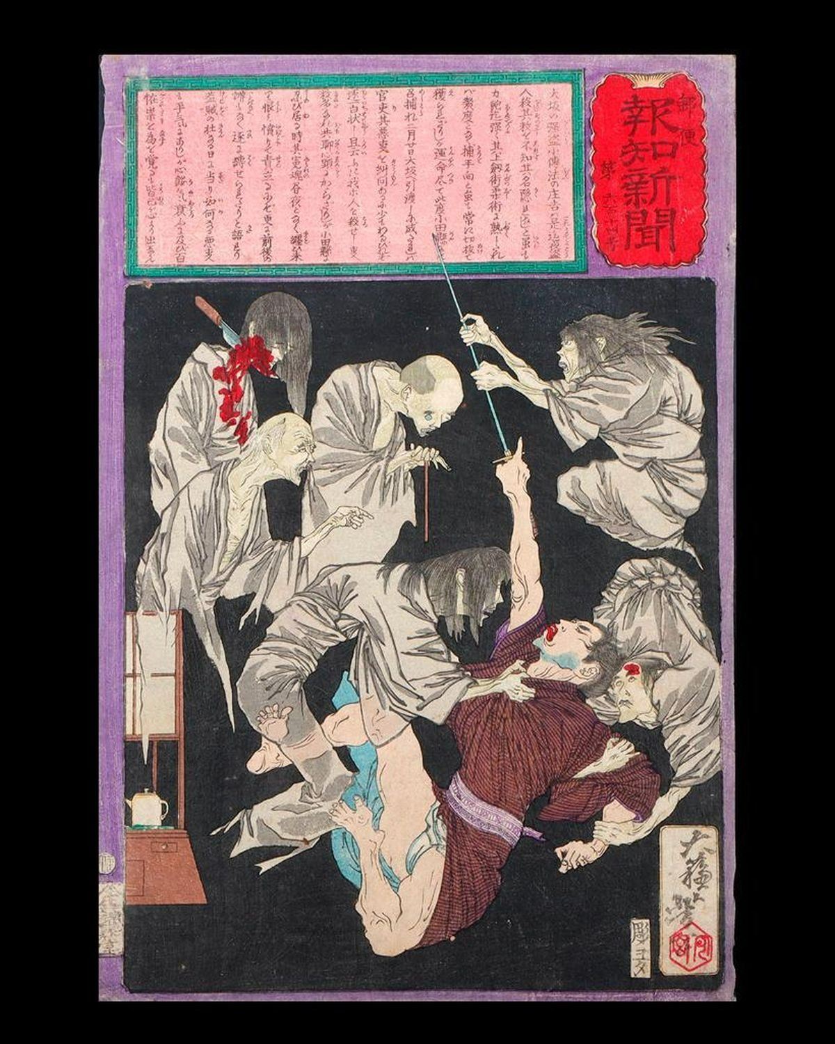 Tsukioka Kinzaburo YOSHITOSHI (1839-1892) Series : The Post Dispatch Newspaper Medium: Woodblock Dimensions : 14x 9in. Condition : Faded, rubbed, and dirty.
