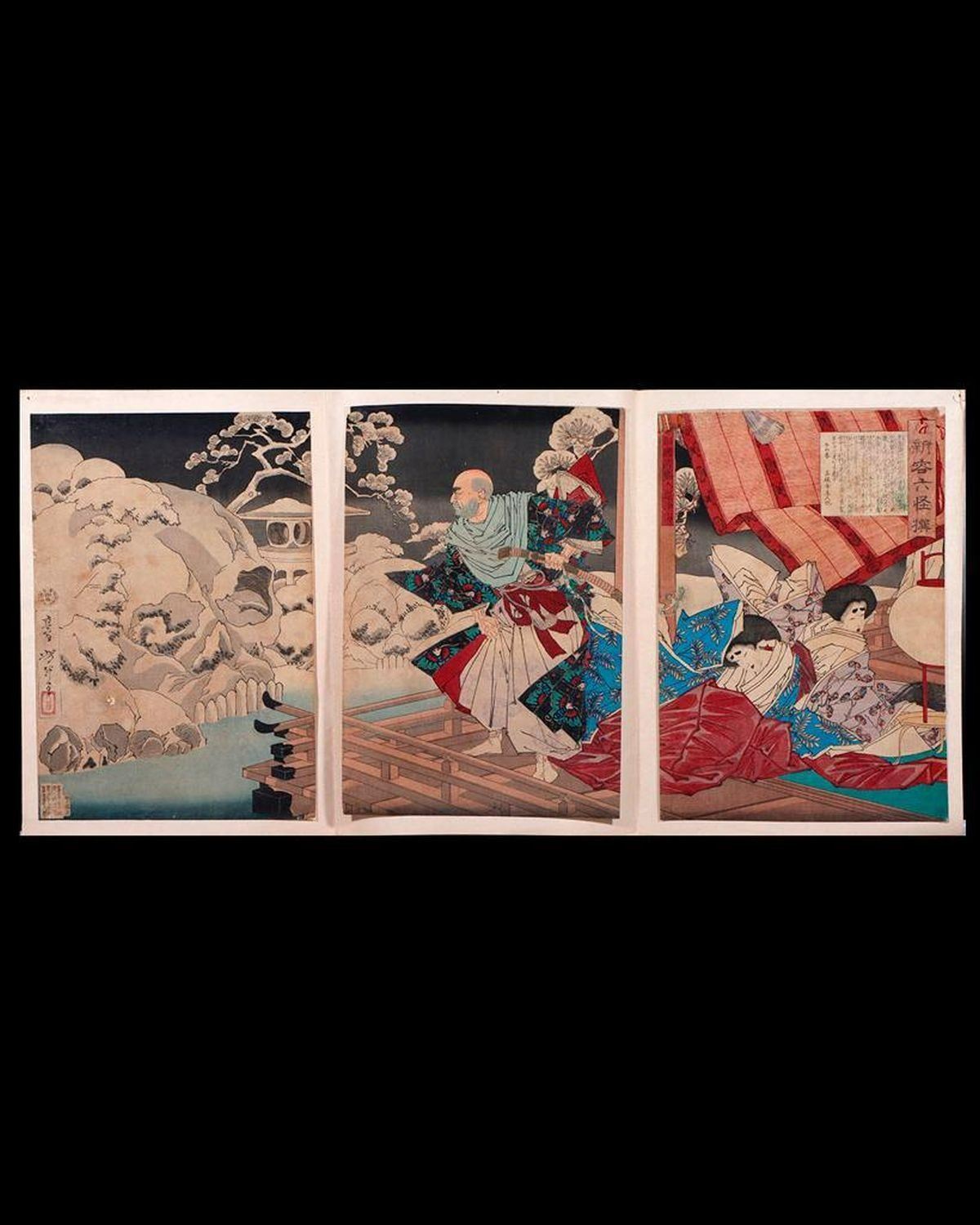 Artist :Tsukioka Kinzaburo YOSHITOSHI (1839-1892) Series :Taira no Kiyomori and skulls in snow, from the series Shinyo Rokaisen Date : (1882) Medium: Woodblock(triptych) Dimensions : 14 x 9 1/2 in. Condition :Backed, stained with small repairs to all three panels, light fading.