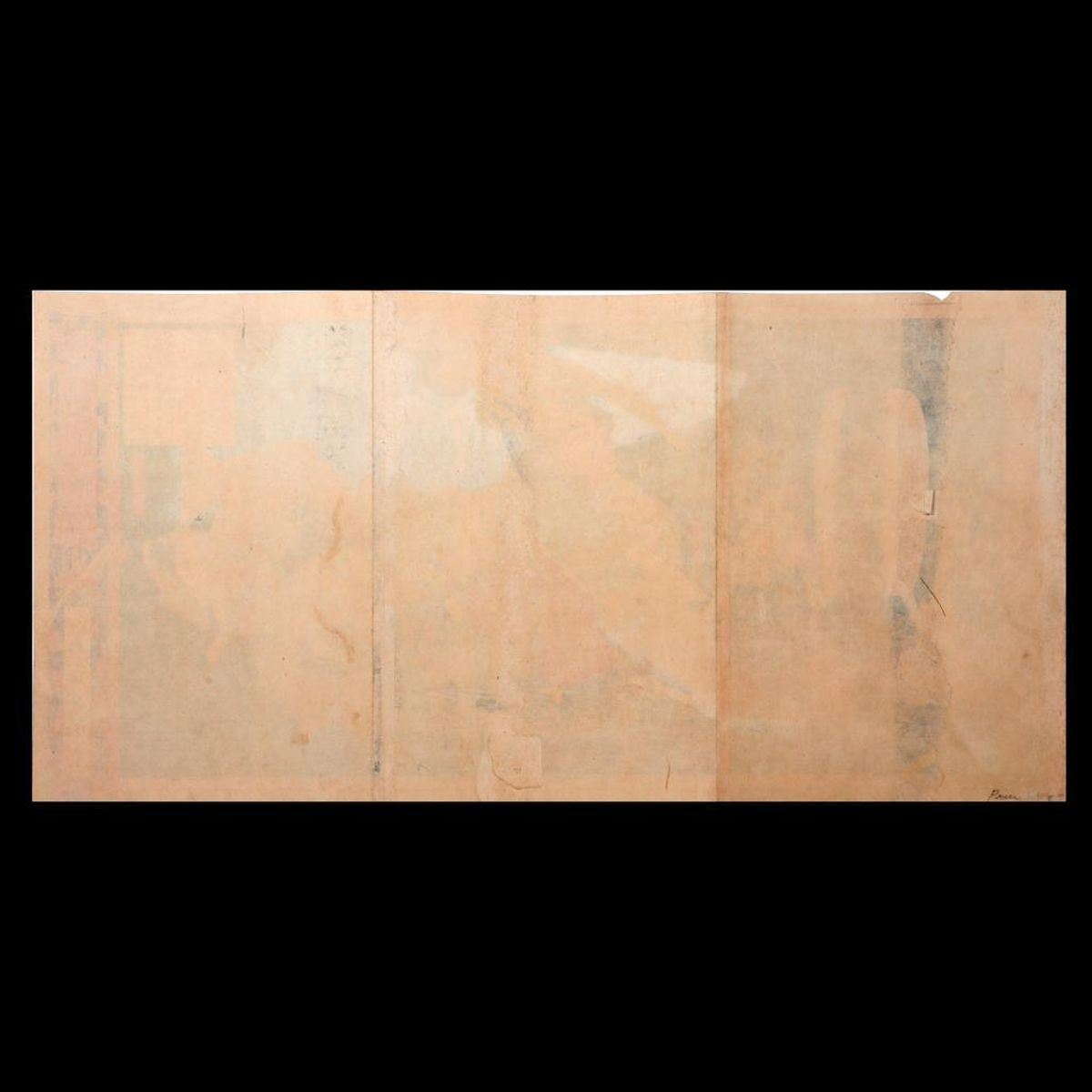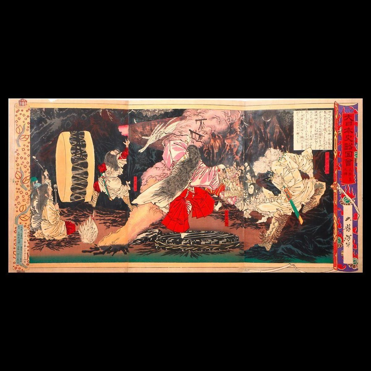 Artist : Tsukioka Kinzaburo YOSHITOSHI (1839-1892) Series : Ame no Uzumeno Mikoto Dancing to Lure Amaterasu Omikamifrom her Cave. Date : (1879) Medium: Woodblock (triptych) Dimensions : 14 x 281/4in. (overall size) Condition : Backed with losses to the top left border, stained, fading.