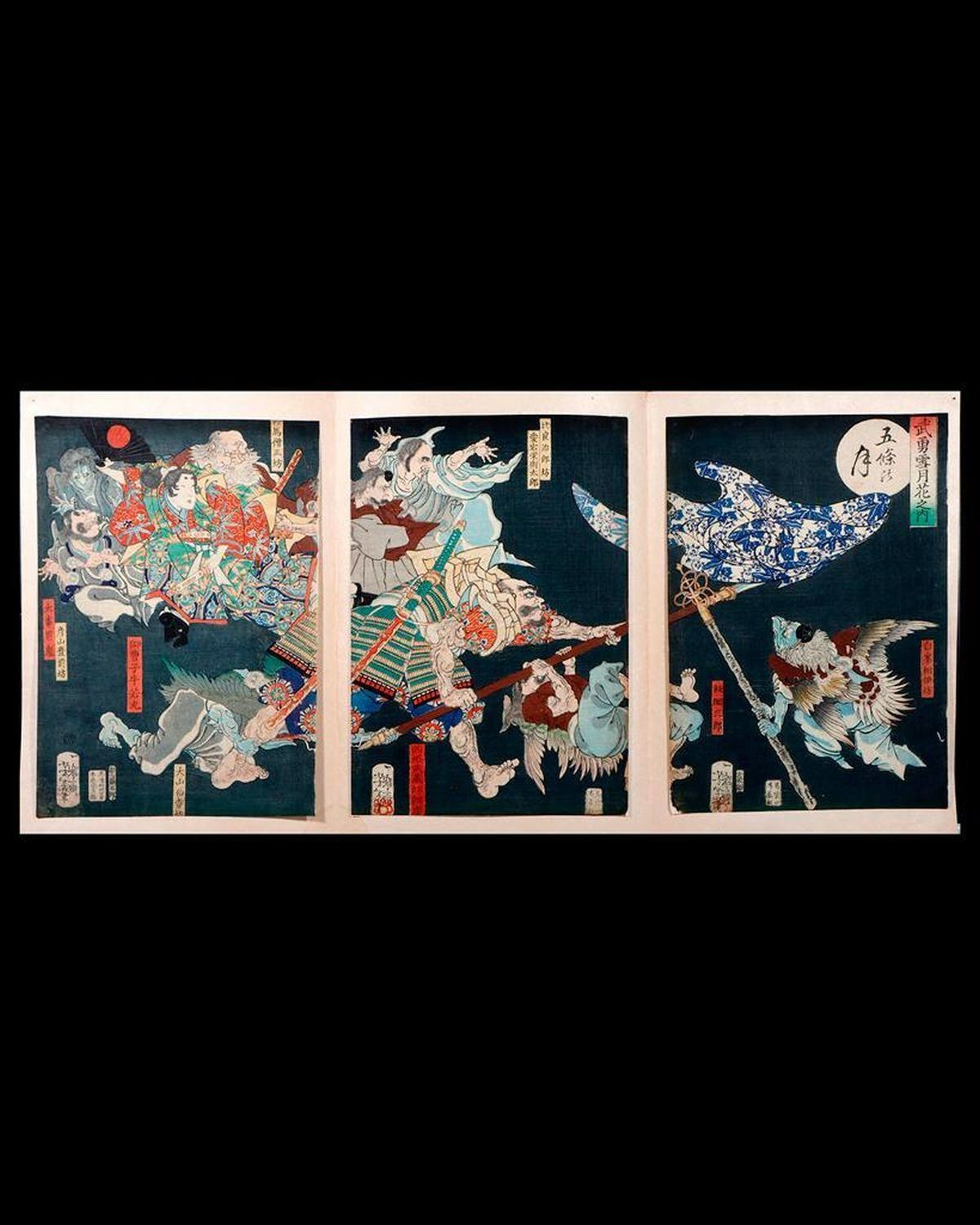 Artist : Tsukioka Kinzaburo YOSHITOSHI (1839-1892) Series : Tengu (mountain goblins) Date : (c.1852) Medium: Woodblock (triptych) Dimensions : 131/2x 9 1/2in. Condition : overall good, backed, faded, small holes, trimmed.