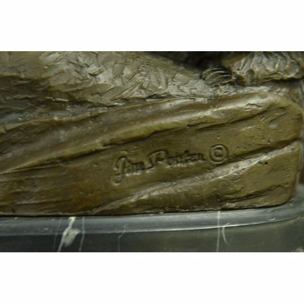 Are you an animal lover? If so, this is a great piece for you! It features a young bear standing on top of a cliff leaning its weight into a rock proudly displaying his catch for the day. To this day, bears play a prominent role in the arts, mythology, and other cultural aspects of various human societies. The bear was thought to possess diplomacy equal to its great strength and it is the emblem of ferocity in the protection of kindred. A bear is also a symbol of healing and personal health, strength and bravery. Bears paws are also often found as crests or symbols on shields. It has been crafted with authentic detail by the artisan, Jim Ponter, and bears his signature in the base. Get one for the animal lover in your life! Condition : This sculpture is in perfect condition. Bronze Dimensions with Marble Base:Height 9" x Width 7 1/2" Marble Dimensions: Diameter 6". Height without base: 8" Weight : 7 LBS Inventory : 19AL3716391