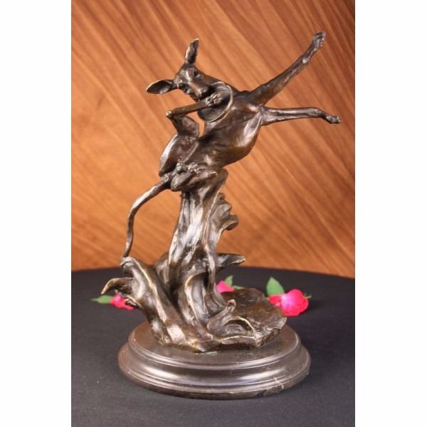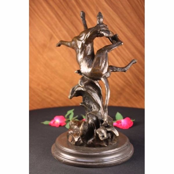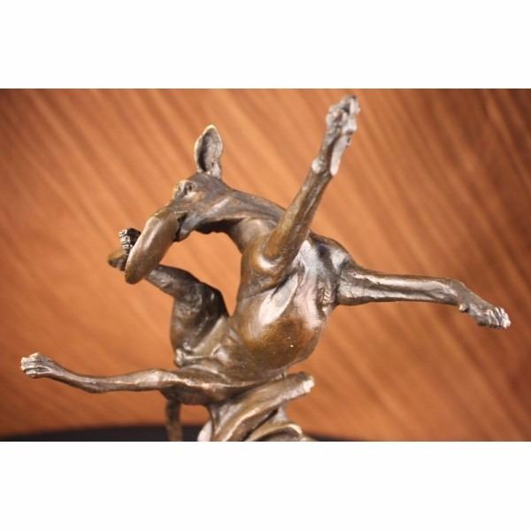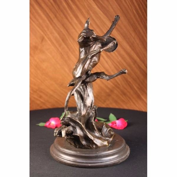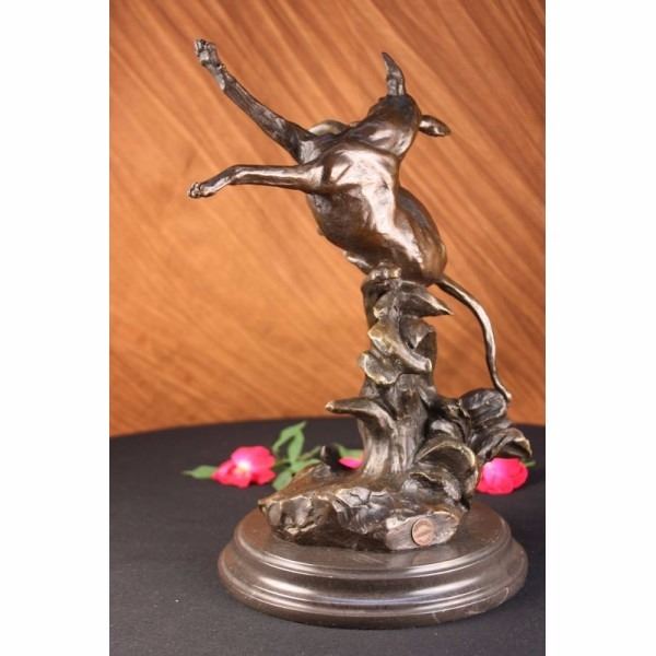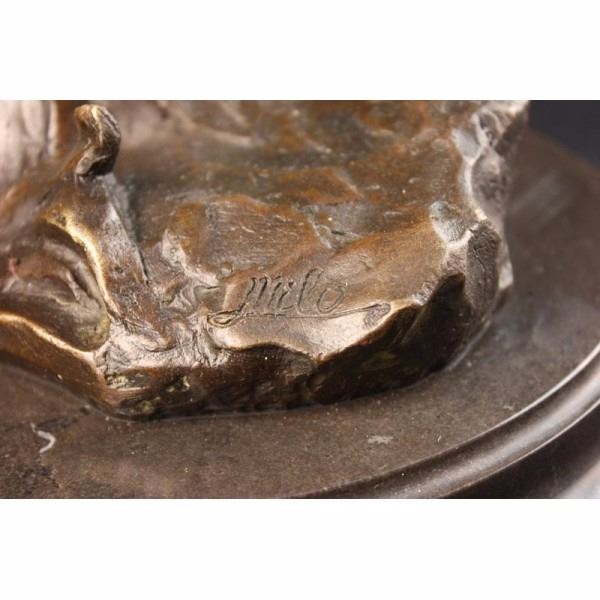 The young frisky pup jumps mid-air almost as if he was lifted up by a gust of wind enabling him to gain height to catch his Frisbee. His front paws outstretched and his hind legs curling up behind him, almost assisting to help catch the Frisbee. He flexes his muscles and you can see detail of his muscles in his neck and body. If you look at the dogs face and body, its almost as if there was no effort put into his jump, The dog just does what is second nature to him. Although the body is twisted, it is in a comfortable playful position. The artist truly captures the character of a dog at play. Young, frisky, energetic, and playful this sculpture just brings out a smile in all of us. This is a great sculpture for an animal lover! Don't wait to spread some smiles! This sculpture is prefect in any office or home.Signed by artist Milo, this hand crafted bronze sculpture was casted using the " Lost Was Method" and has a dark brown patina. Condition: This sculpture is in a very good condition. Bronze Dimensions with Marble Base:Height 13" x Width7 1/2"Marble Dimensions: diameter 7 1/2".Height without base: 5 1/2 " Weight :10 LBSInventory: 5242K12125 The young frisky pup jumps mid-air almost as if he was lifted up by a gust of wind enabling him to gain height to catch his Frisbee. His front paws outstretched and his hind legs curling up behind him, almost assisting to help catch the Frisbee. He flexes his muscles and you can see detail of his muscles in his neck and body. If you lo
