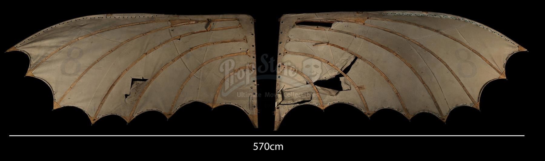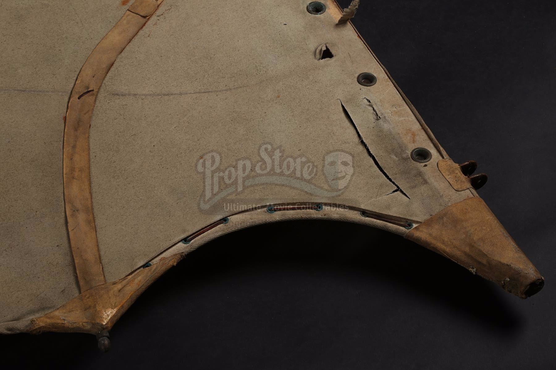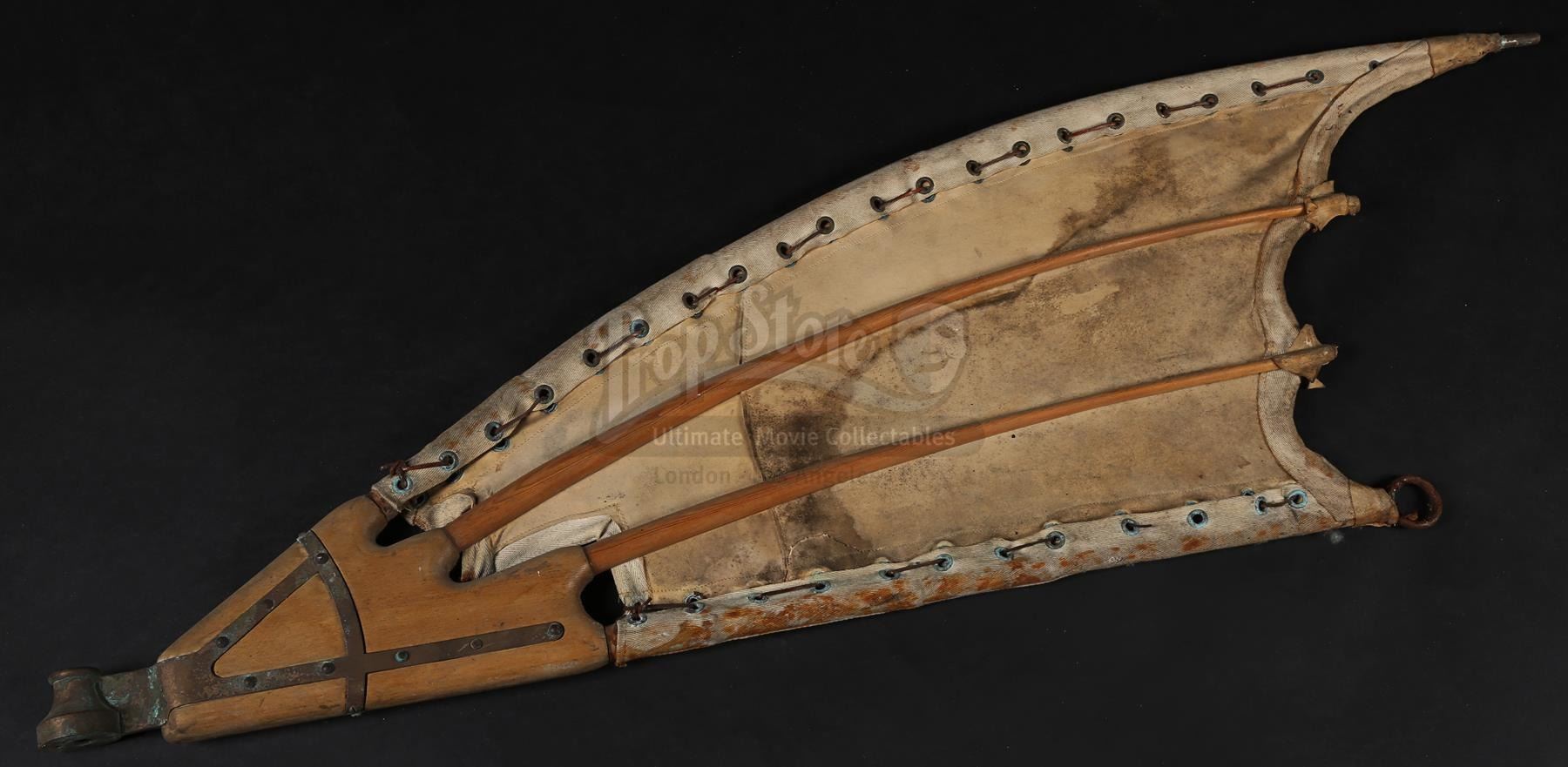 The components consist of two central wings, a tail wing and a front wing. They have a wooden skeletal frame that is reinforced with metal for stability. The frames are covered in treated canvas, secured with leather thong ties through metal findings. A number eight is printed on the central wings in dark grey ink, denoting the eighth incarnation of the invention. The components show age and production use throughout, including tears in the canvas on the central wings, rusting and water damage. The leather thong ties have also become brittle. Dimensions (largest wing): 130 cm x 282 cm x 10 cm (51 1/4'' x 111'' x 11 3/4'')