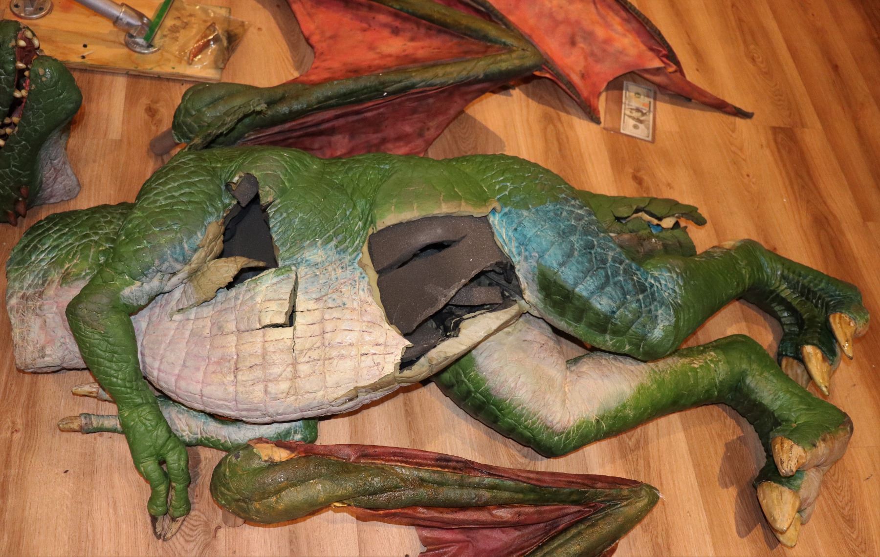Made to see from one side. The head has some paint and foam loss from storage. One horn is loose and there is an extra. A piece of foam from the back side is loose but included. I don't think there ever was a complete tail.