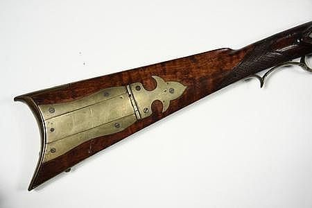 YOUTH SIZED LONG GUN - Youth Sized Percussion Long Gun with tiger maple stock, unmarked, with 33IN octagonal barrel, brass fittings including longtail trigger guard, shaped patch box and butt guard, open sights. Note in patch box indicates this is a Pennsylvania. Boys smooth bore rifle, 1780-1815, .40 cal, and appears on page 189 of the book~American Gun Makers~ published in 1953. 49IN long overall.