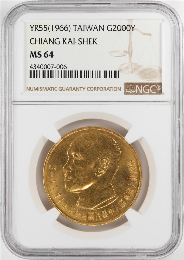 One YR55 (1966) Taiwan 2000 Yuan Chaing Kai-Shek Gold Coin NGC MS64. NGC Certified.
