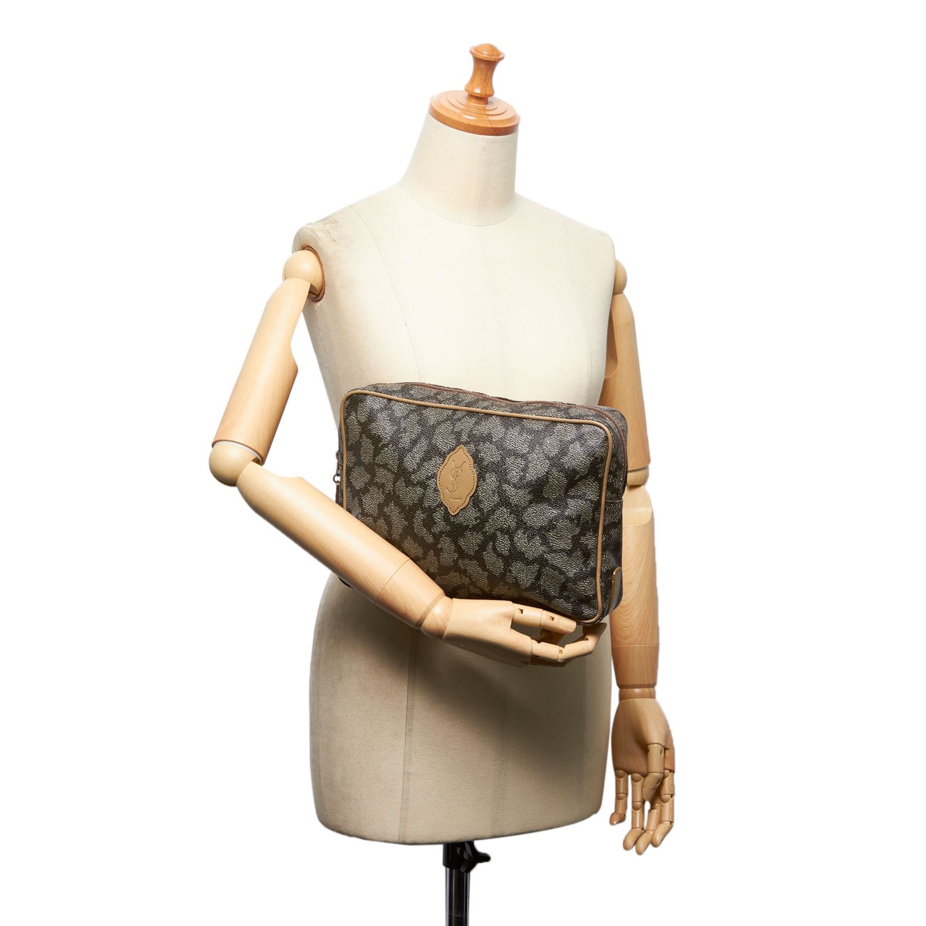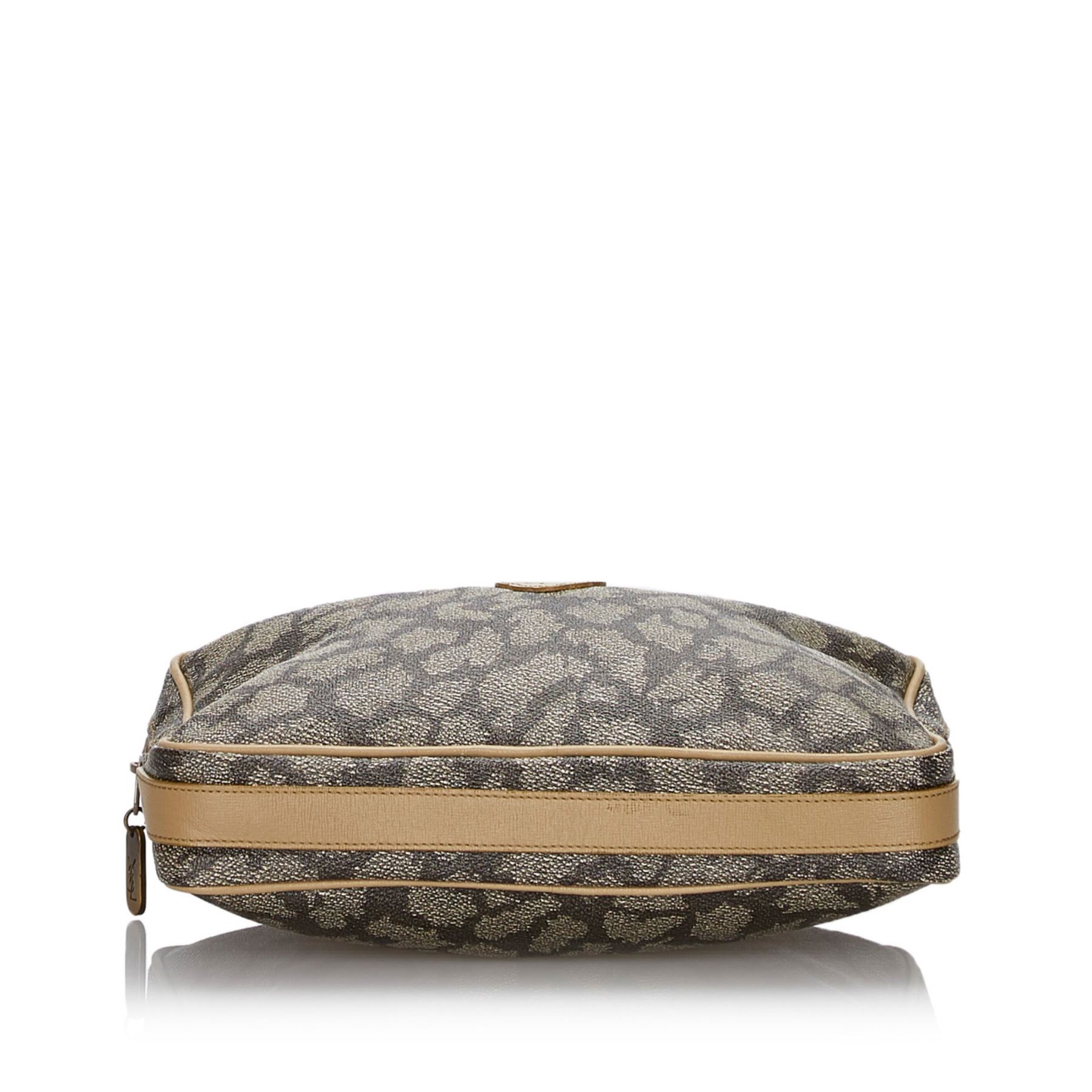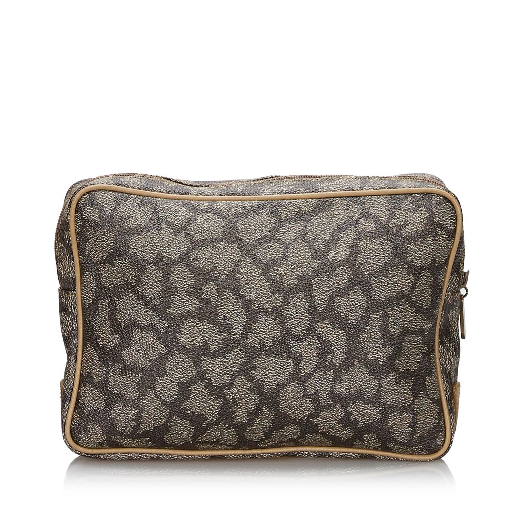 This clutch bag features a PVC body with leather trim, back exterior zip pocket, a top zip closure, and an interior zip pocket. Plastic x PVC x Leather x Others Gray x Multi Exterior bottom is scratched. Size: 20 x 27 x 5 Card: NO Made in: FRANCE