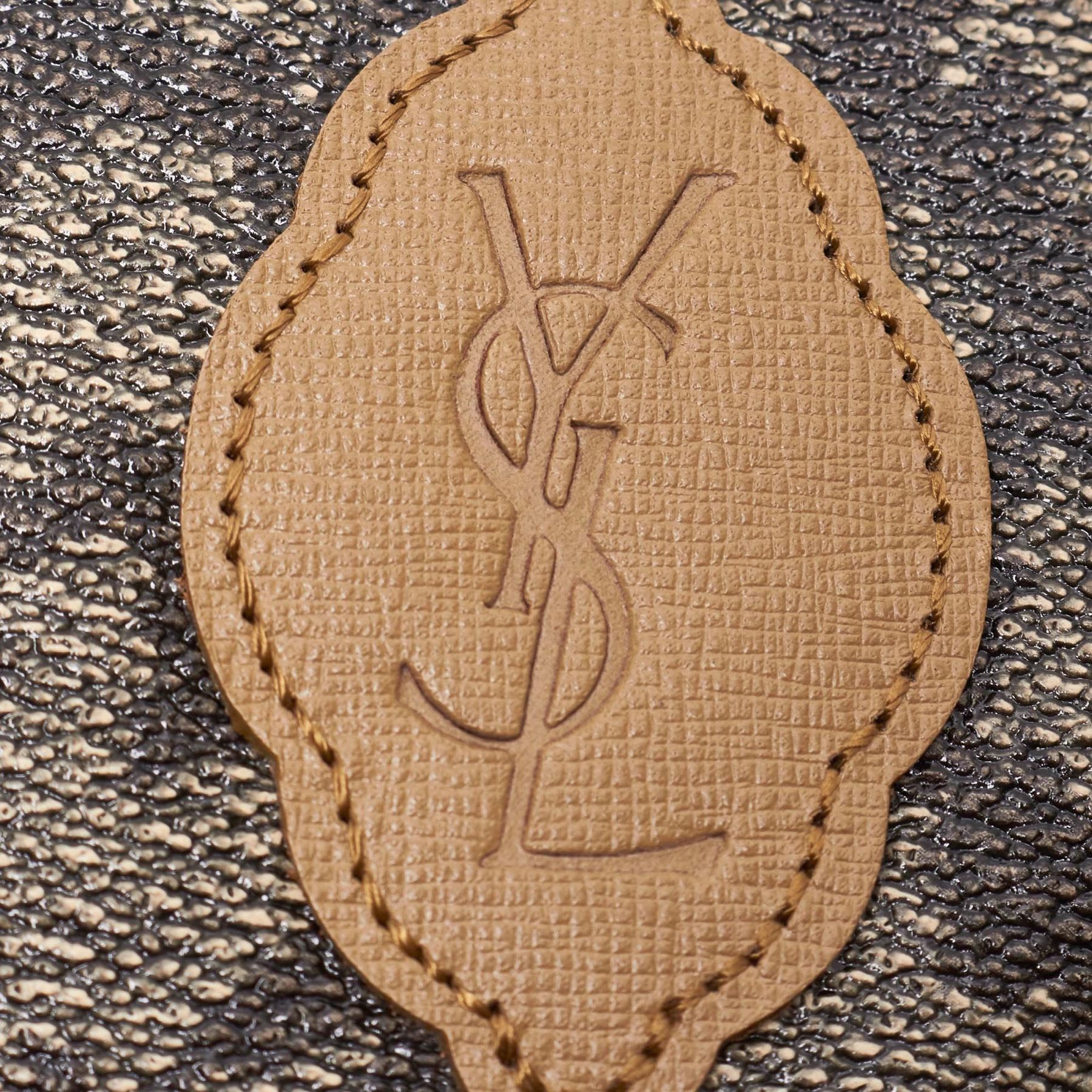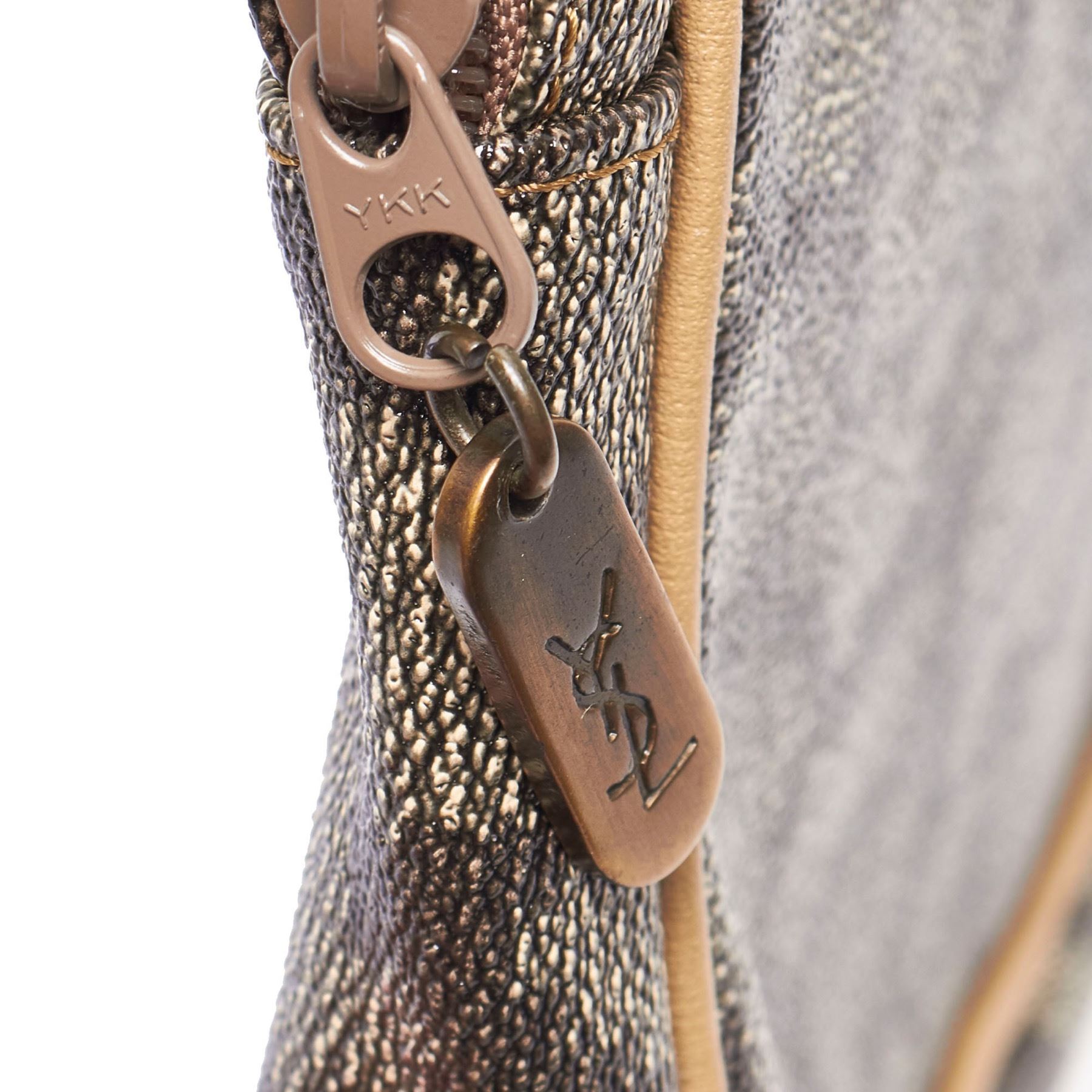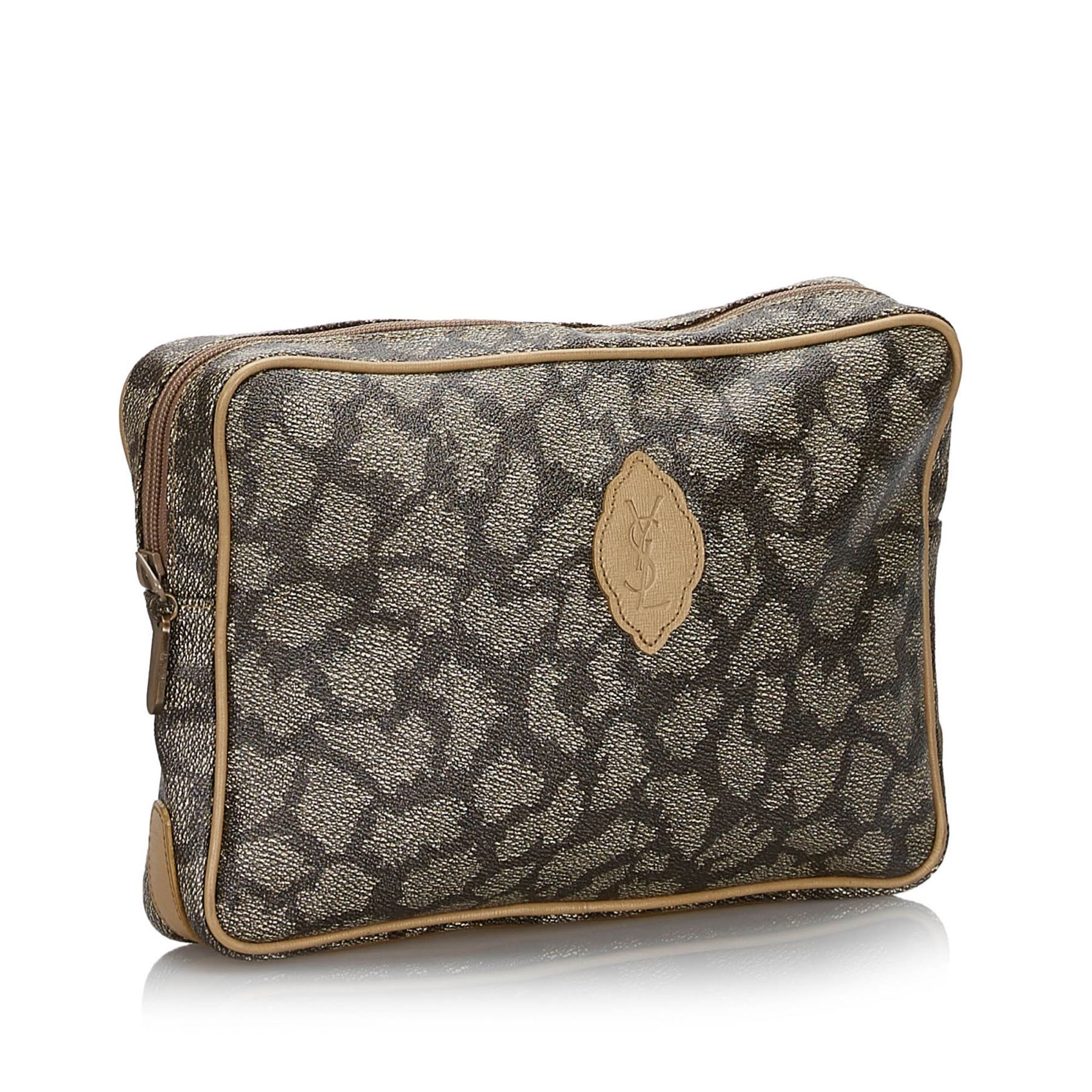 This clutch bag features a PVC body with leather trim, back exterior zip pocket, a top zip closure, and an interior zip pocket. Plastic x PVC x Leather x Others Gray x Multi Exterior bottom is scratched. Size: 20 x 27 x 5 Card: NO Made in: FRANCE