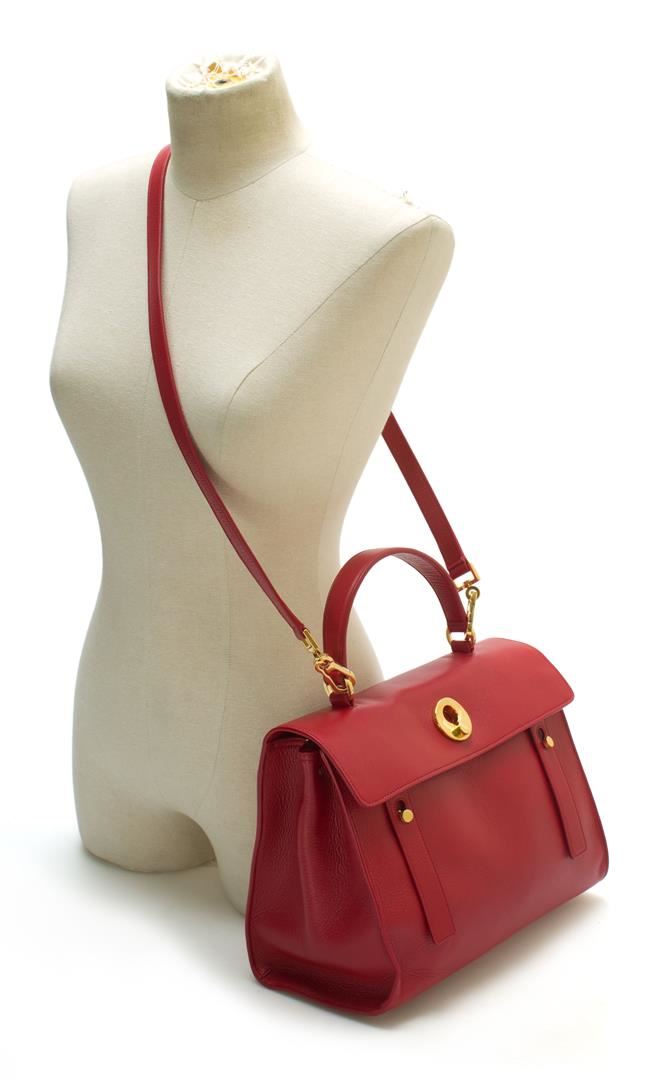 Saint Laurent YSL Muse 2 red leather bag - all leather including sides Single top handle with 4.5" drop 3 Studs closures / push studs to expand sides 2 compartment and interior zip pocket, exterior flap pocket Bottom metal studs for protection Gold tone hardware Fully lining in fine red suede Dimension: size Medium / approx. 19.5"H X 2.5" L X 6"D It comes with detachable strap with drop 21.5", This is a brand new bag.