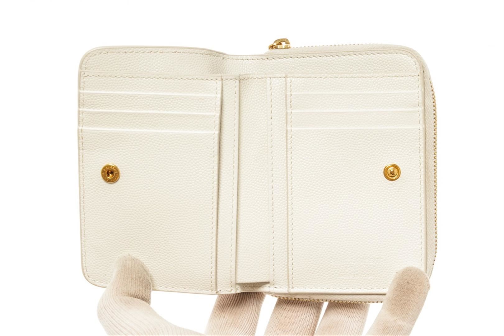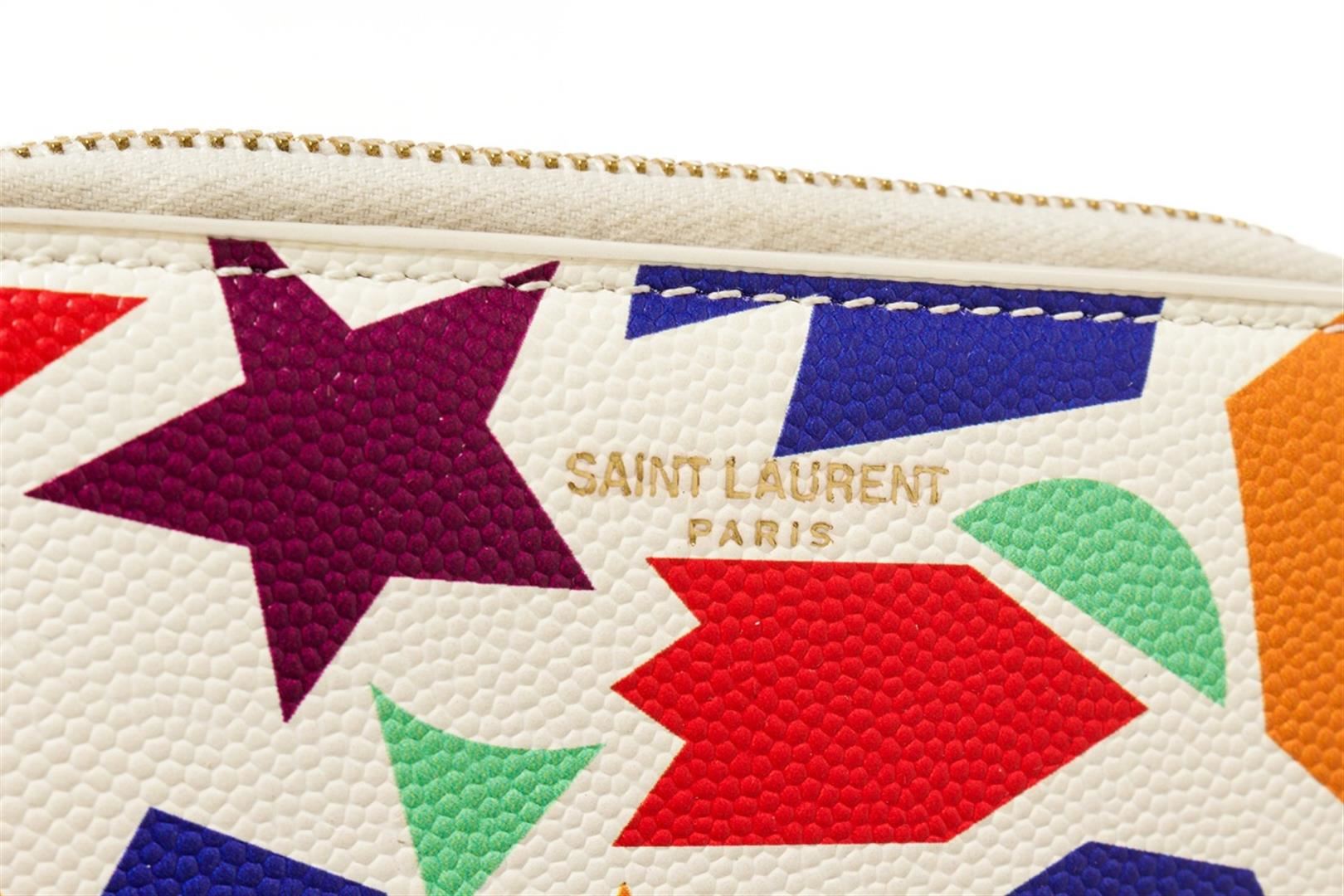 One YSL Saint Laurent White Multicolor Pebbled Leather Compact Zippy Wallet. Item is sold AS-IS. All available information is listed in the description and shown in the photo. ysl saint laurent white multicolor pebbled leather compact zippy wallet with white grained leather featuring multicolor printed flame patterns with gold-tone hardware, logo stamp at front, zip-around closure, black leather lining and three main compartments. Height: 1.5" Width: 4.75" Depth: 3.5, Handle Drop: / 3.81 x 12.07 x 8.89 Cm