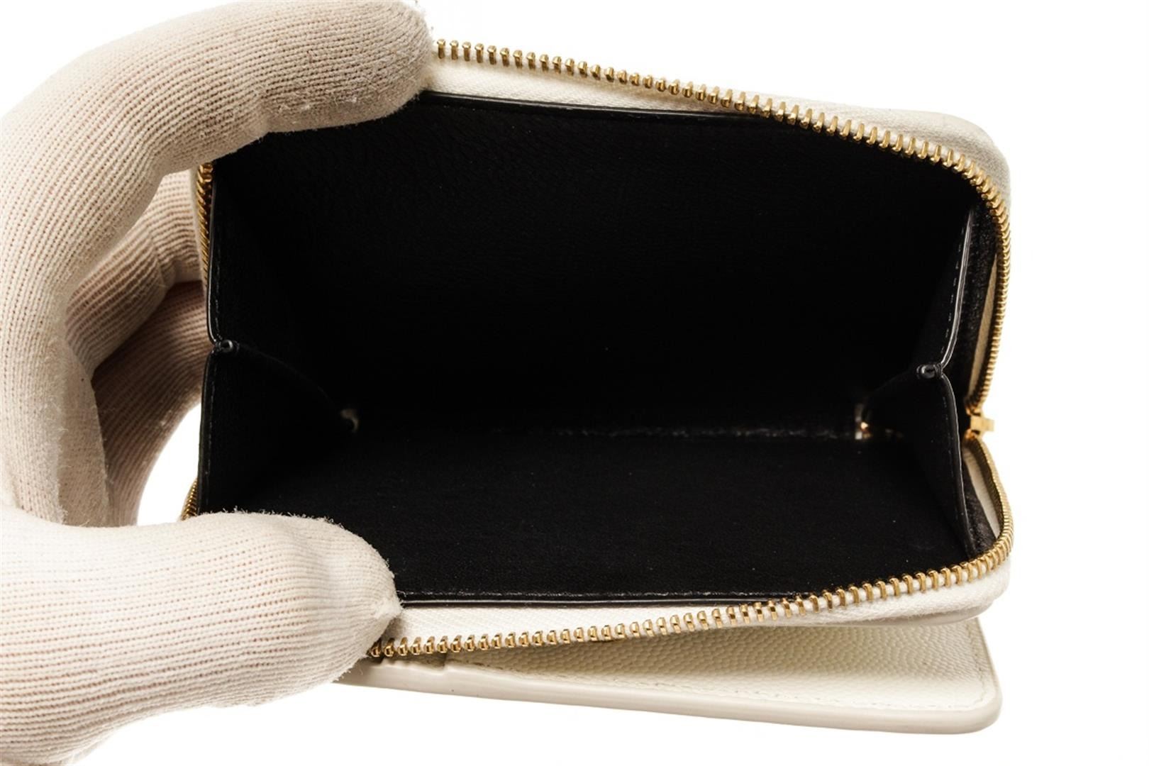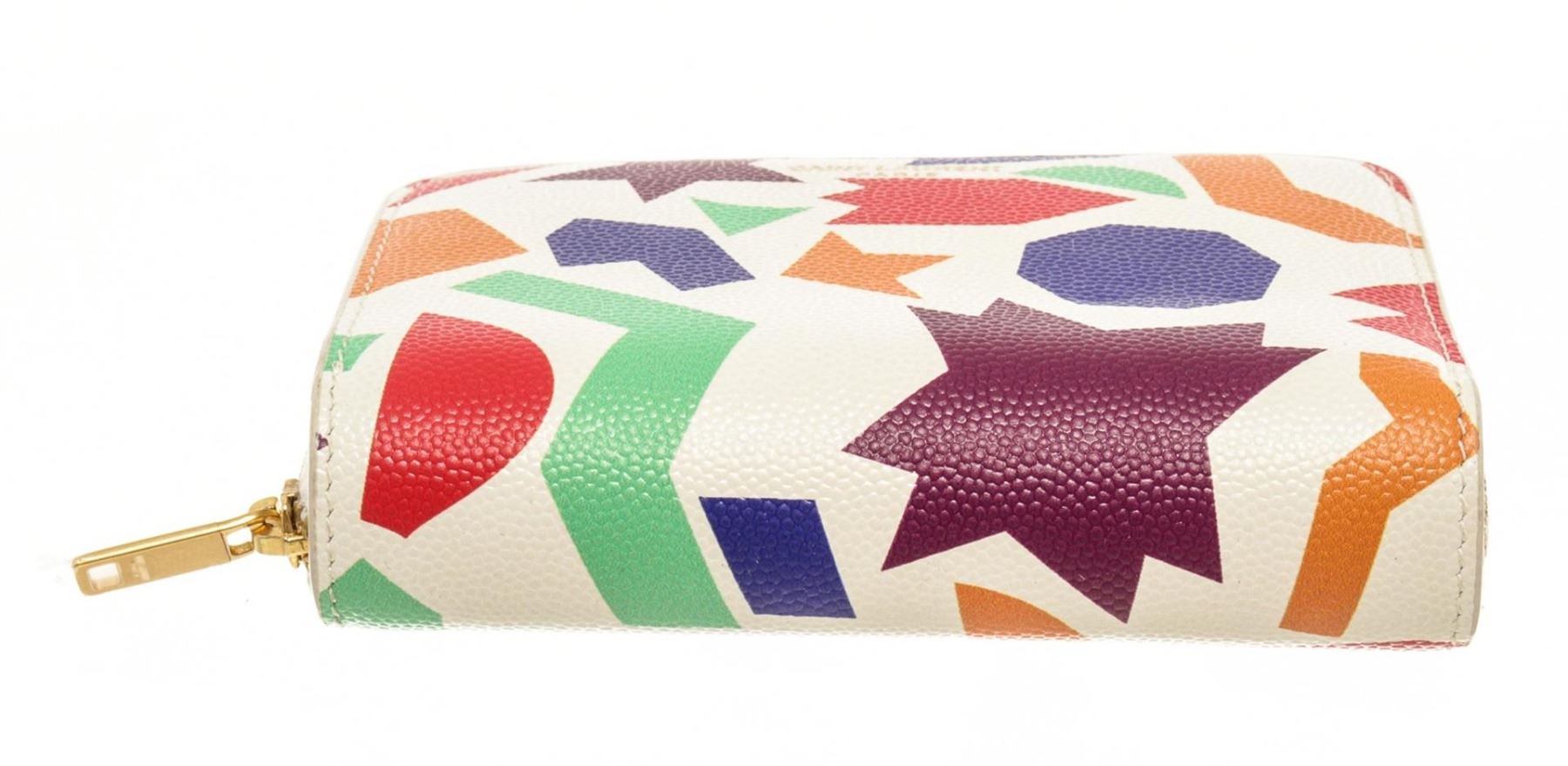 One YSL Saint Laurent White Multicolor Pebbled Leather Compact Zippy Wallet. Item is sold AS-IS. All available information is listed in the description and shown in the photo. ysl saint laurent white multicolor pebbled leather compact zippy wallet with white grained leather featuring multicolor printed flame patterns with gold-tone hardware, logo stamp at front, zip-around closure, black leather lining and three main compartments. Height: 1.5" Width: 4.75" Depth: 3.5, Handle Drop: / 3.81 x 12.07 x 8.89 Cm