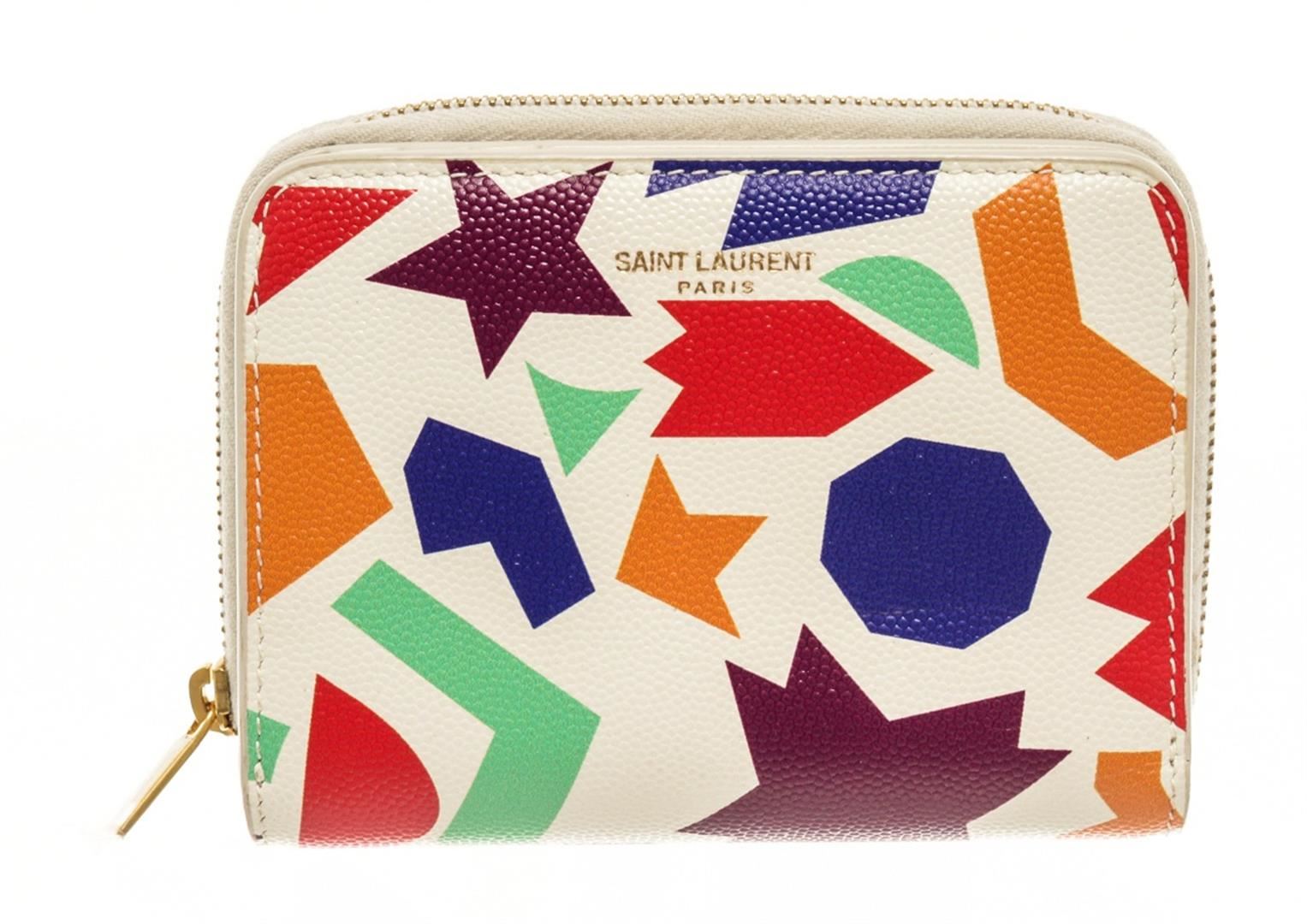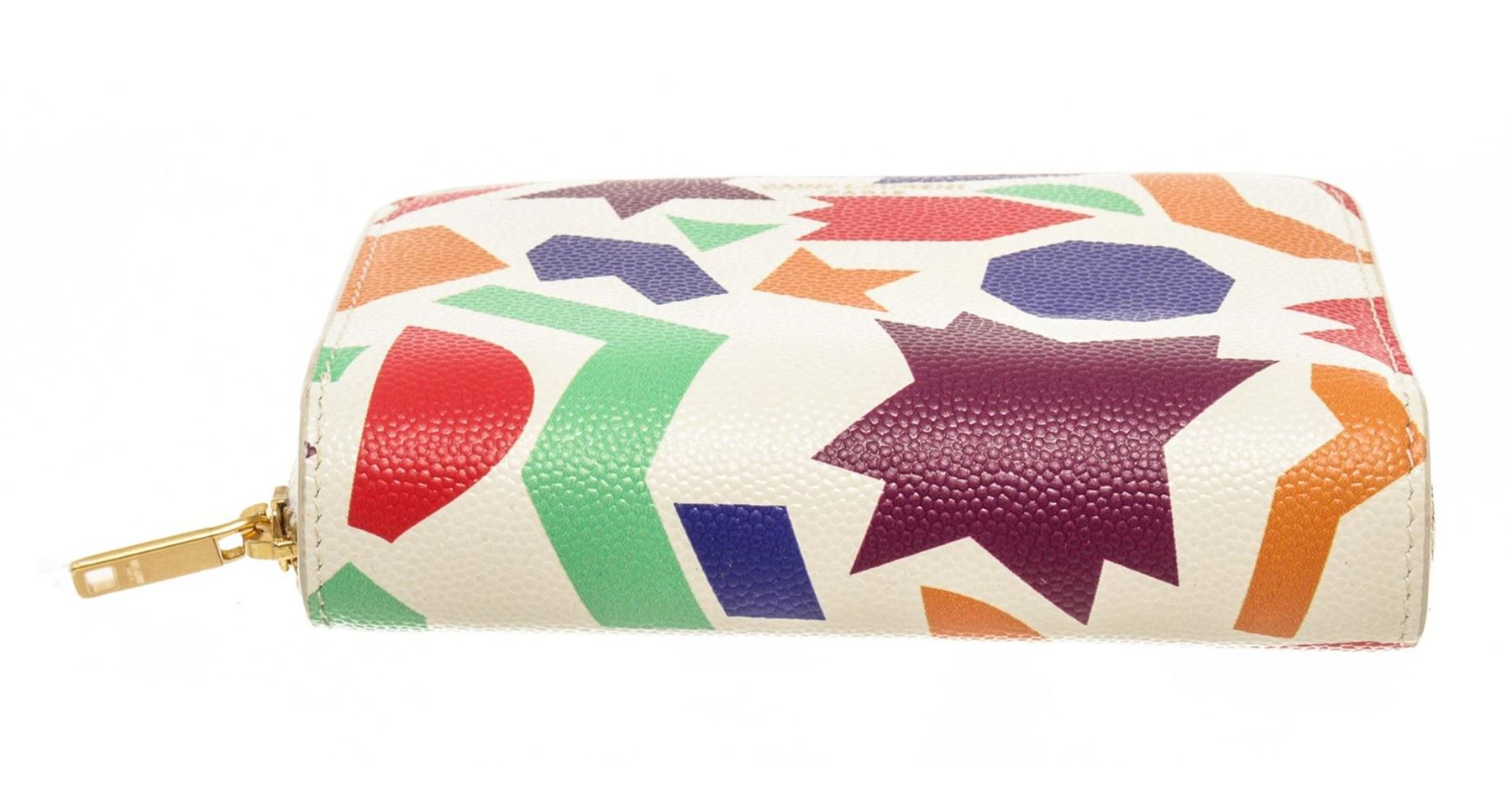 One YSL Saint Laurent White Multicolor Pebbled Leather Compact Zippy Wallet. Item is sold AS-IS. All available information is listed in the description and shown in the photo. ysl saint laurent white multicolor pebbled leather compact zippy wallet with white grained leather featuring multicolor printed flame patterns with gold-tone hardware, logo stamp at front, zip-around closure, black leather lining and three main compartments. Height: 1.5" Width: 4.75" Depth: 3.5, Handle Drop: / 3.81 x 12.07 x 8.89 Cm