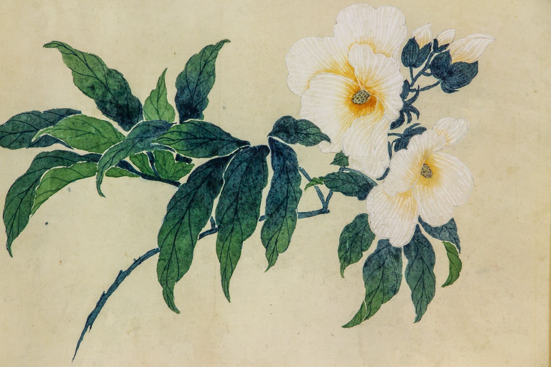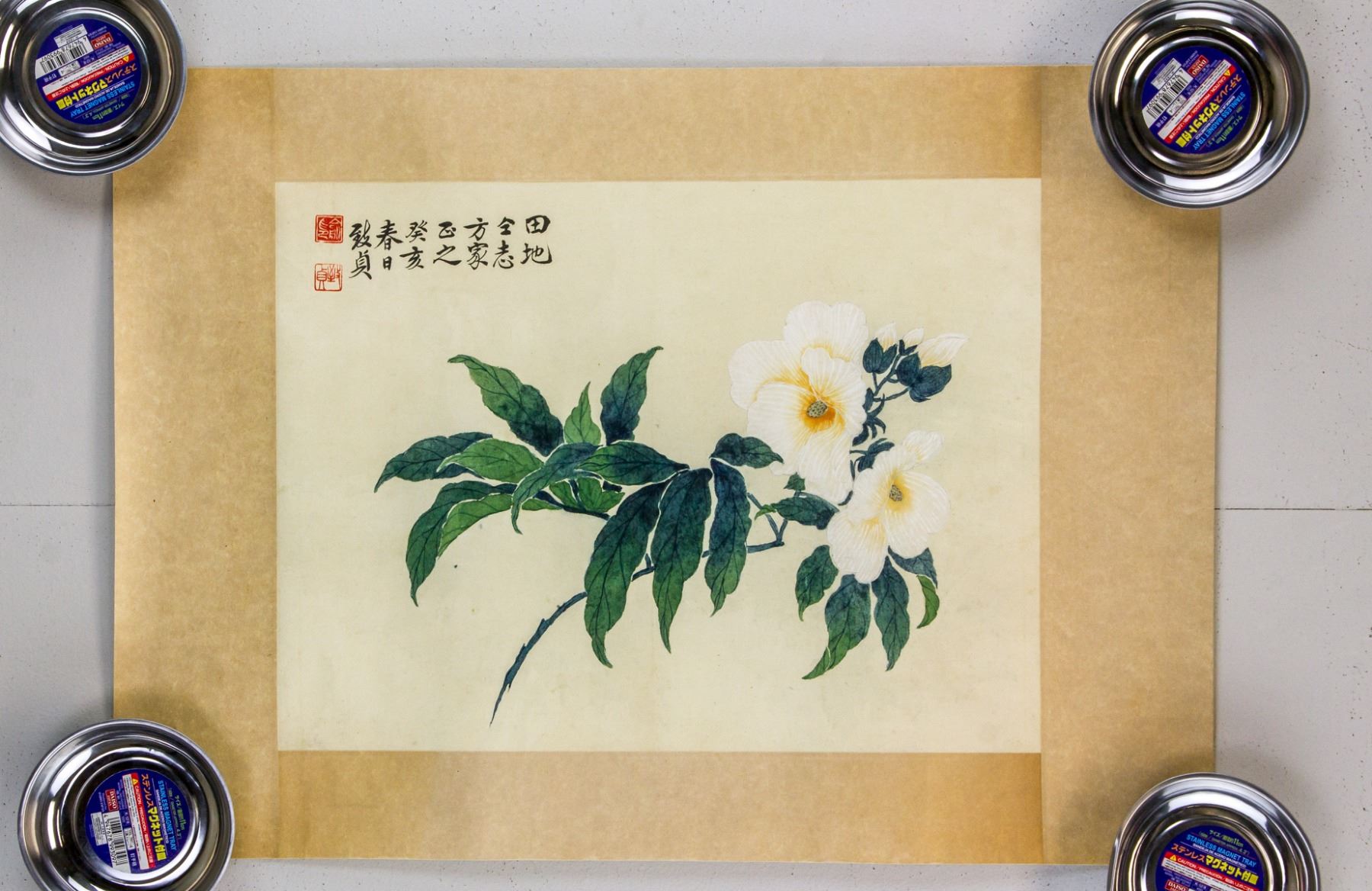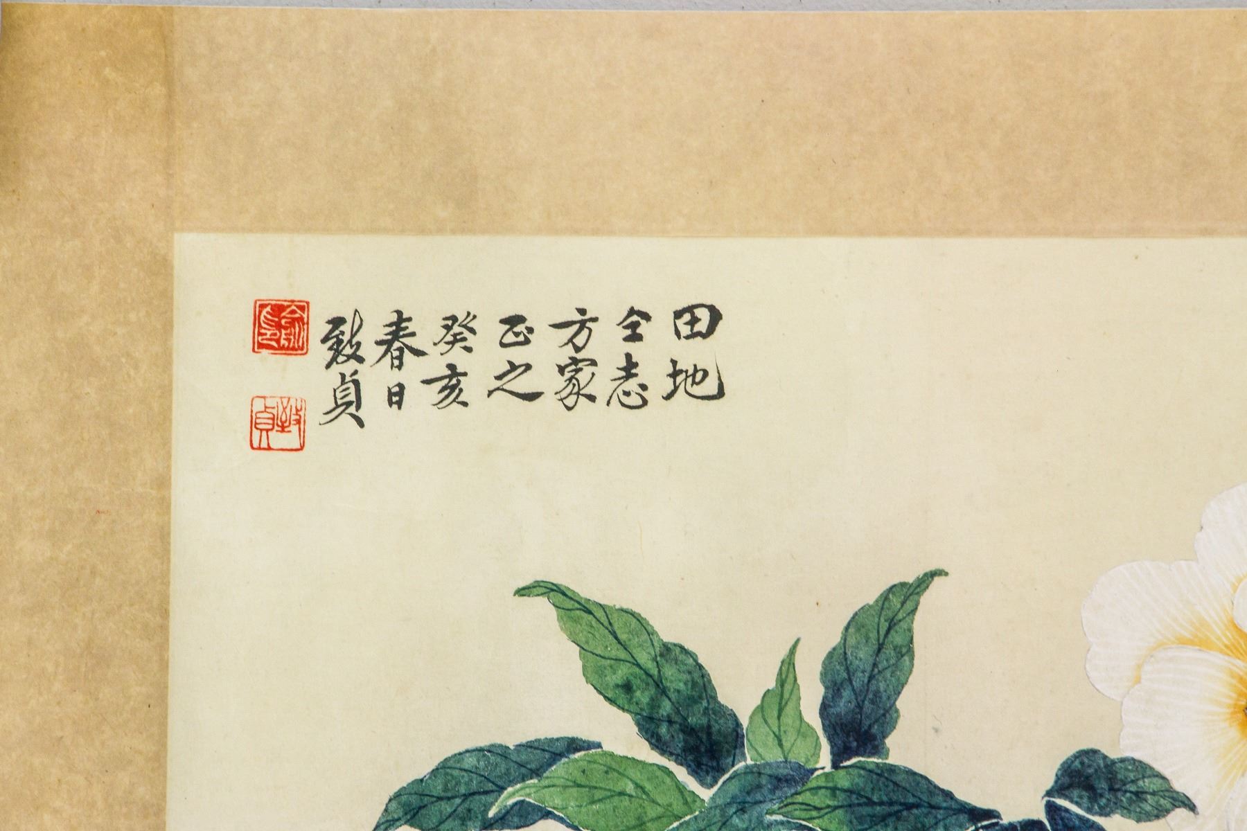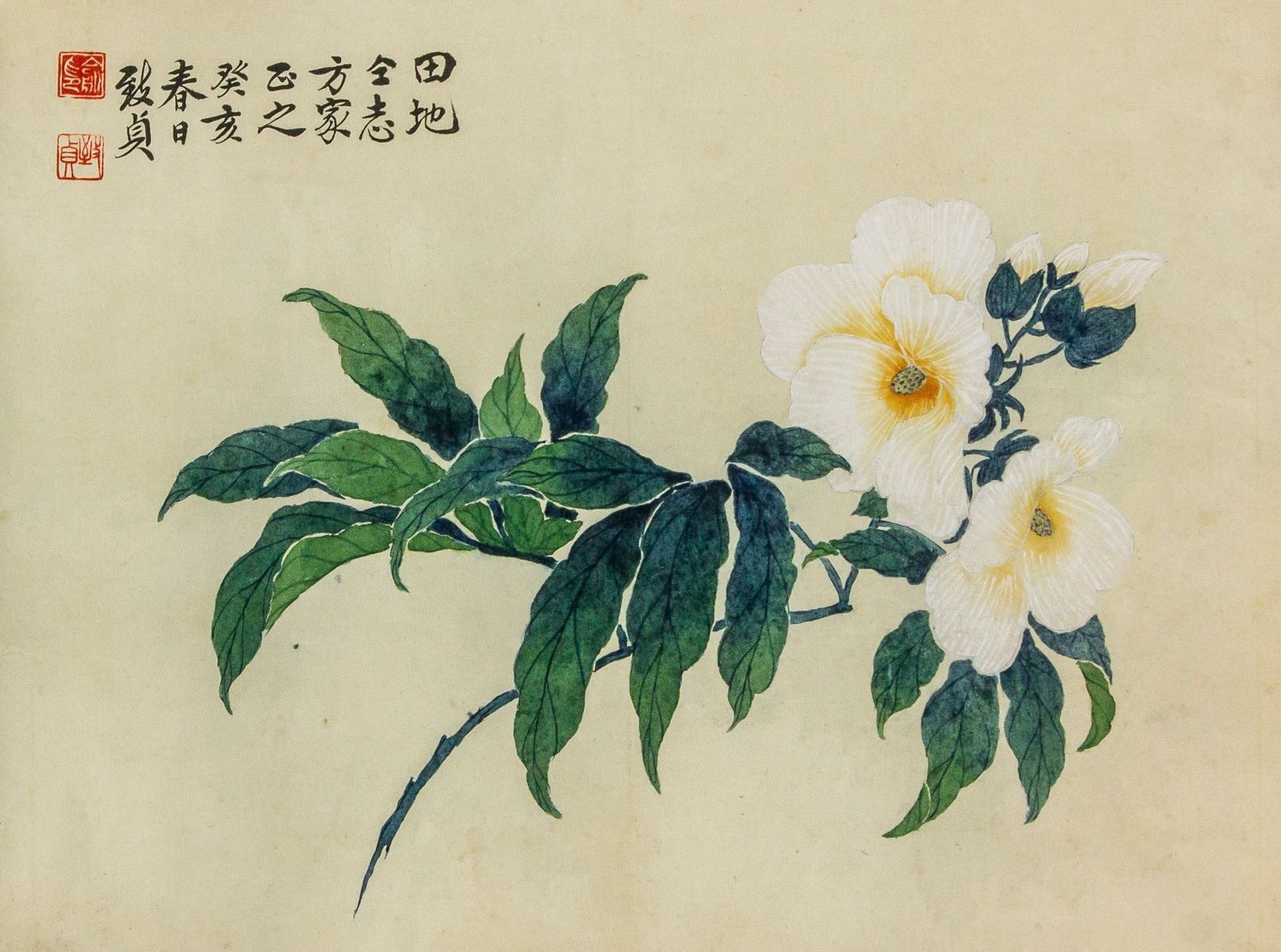 Ink and watercolour on paper roll, featuring white Asiatic apple flowers, signed Yu Zhizhen (1915-1995); inscribed with 2 artist seals; 39 x 29 cm. PROVENANCE: Property of a gentleman (Nagoya, Japan)
