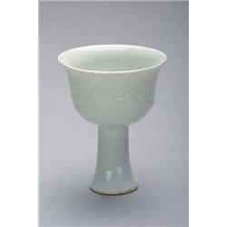 Very rare and superbly moulded, Chinese Yuan Dynasty, white ware porcelain stem cup of fine form and with slight bluish tinge to glaze (minor glaze flaws and minute frits to foot rim), H: 4"