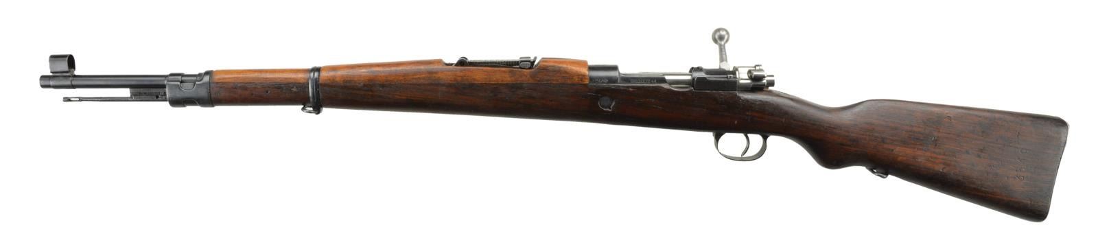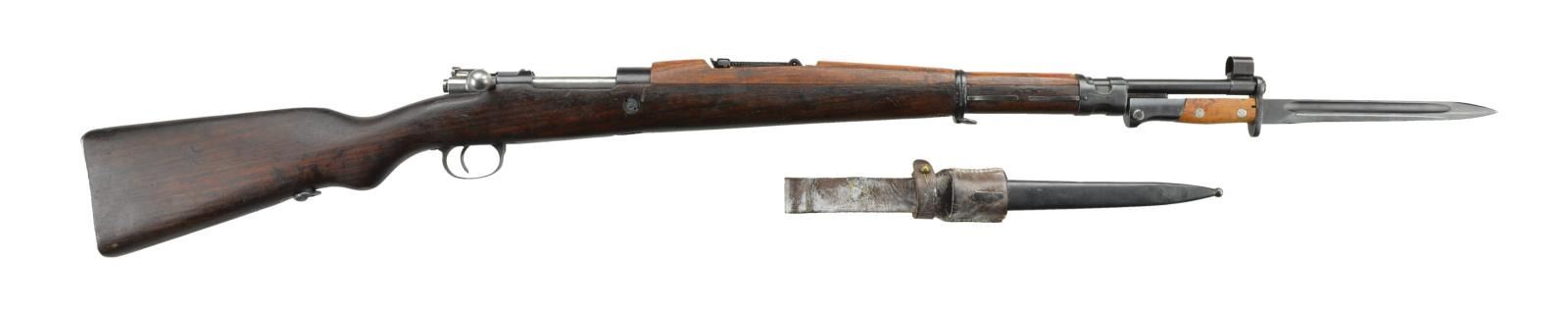 8mm Mauser. S #Z3549. Bbl. 23" with import marking. Floorplate and triggerguard are mismatched, all other visible parts are matching. Top of receiver marked w/ Yugoslavian crest. Right of receiver marked w/ factory S # and importer added serial number. Left side of receiver marked M24/47. Left side rail marked "PREDUZECE 44". Tangent rear sight graduated to 2000m. Inverted V front sight w/ hood. Cleaning rod present. Bottom mounted sling swivels. Hardwood stock set w/ lighter elm handguard. UNATTACHED ACCESSORIES: Yugo 1948 bayonet, scabbard & frog. Blade marked " PREDUZECE 44" and it is matching numbered to the scabbard. Blued parts of bayonet show light silvering & oxidation. Frog shows scattered white staining & some loose stitching around the scabbard. Scabbard shows a couple dents, some silvering and thinning. CONDITION: stock set has dark armory oil finish w/ a couple small chips near floorplate, scattered handling marks and dings. Metal retains 90% arsenal reworked blue w/ some spots of blued over pitting on receiver, scratches & dings on bottom metal and silvering on the exposed edges. Very good bright bore. (22-2459/MJC). CURIO. $300-400.