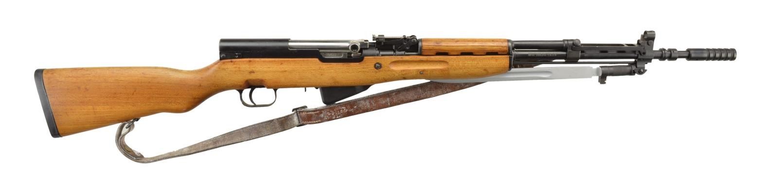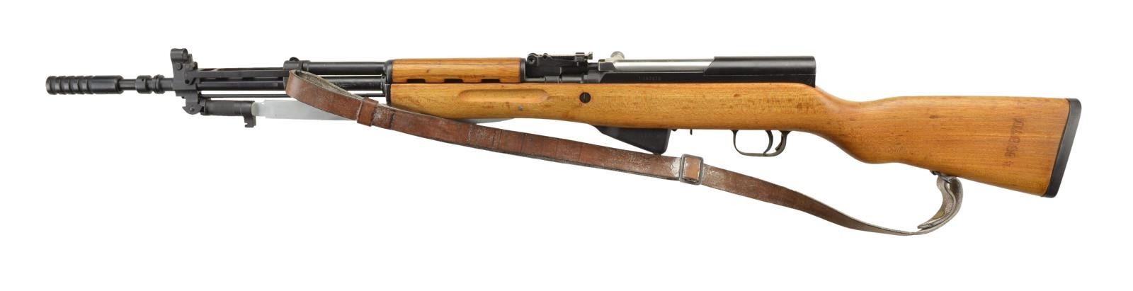 Cal. 7.62x39. S# L-463870. Bbl 23" with integral grenade launcher and import marking. All matching numbers Left side of receiver marked with S#. Tangent rear night sight graduated to 1000 meters. Hooded post front sight with flip up night sight. Cleaning rod is present. 11 1/2" fullered folding blade bayonet. Hardwood stock with correct rubber buttplate. Original sling included that shows scattered white flaking. CONDITION: arsenal reworked stock shows light handling marks, white sling residue on left side and some minor scuffs. Metal retains 90% arsenal rework blue with some handling marks and a few light scratches. Good bore which shows some a couple spots of light pitting but is shiny throughout much of its length. (22-2615/MJC). CURIO. $300-500