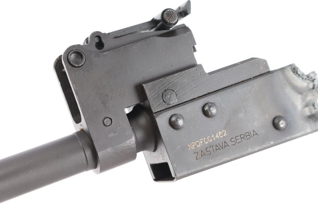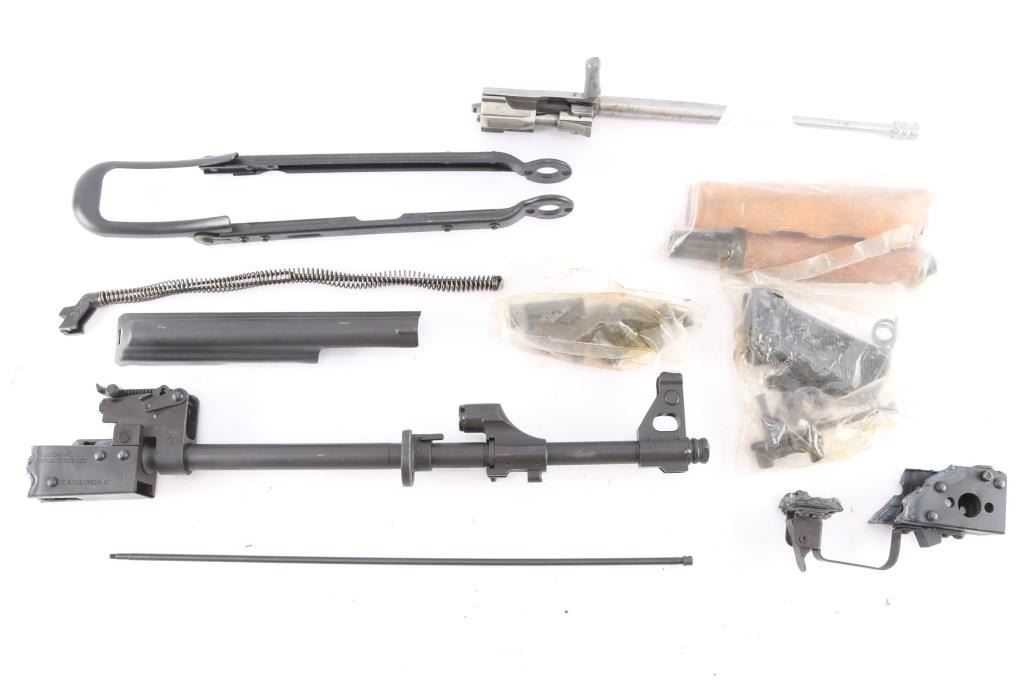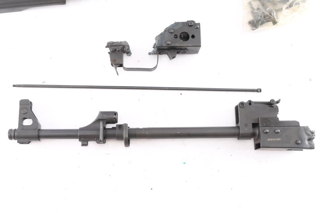 Zastava M70 Stamped under Folder 7.62x39. Kit has populated barrel in excellent condition, all metal parts and wood handguards in very good condition. Torch cut receiver section with rear trunnion, trigger guard and release button.