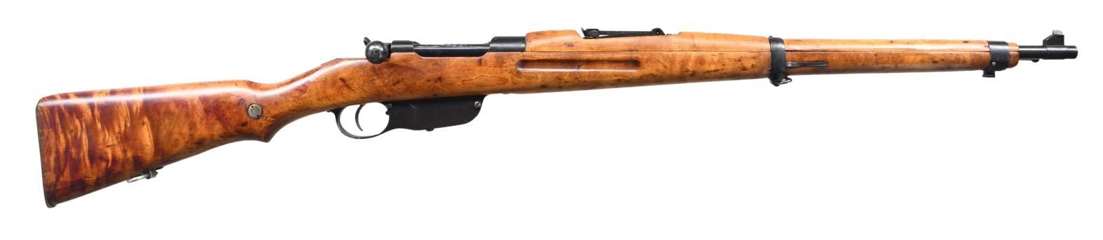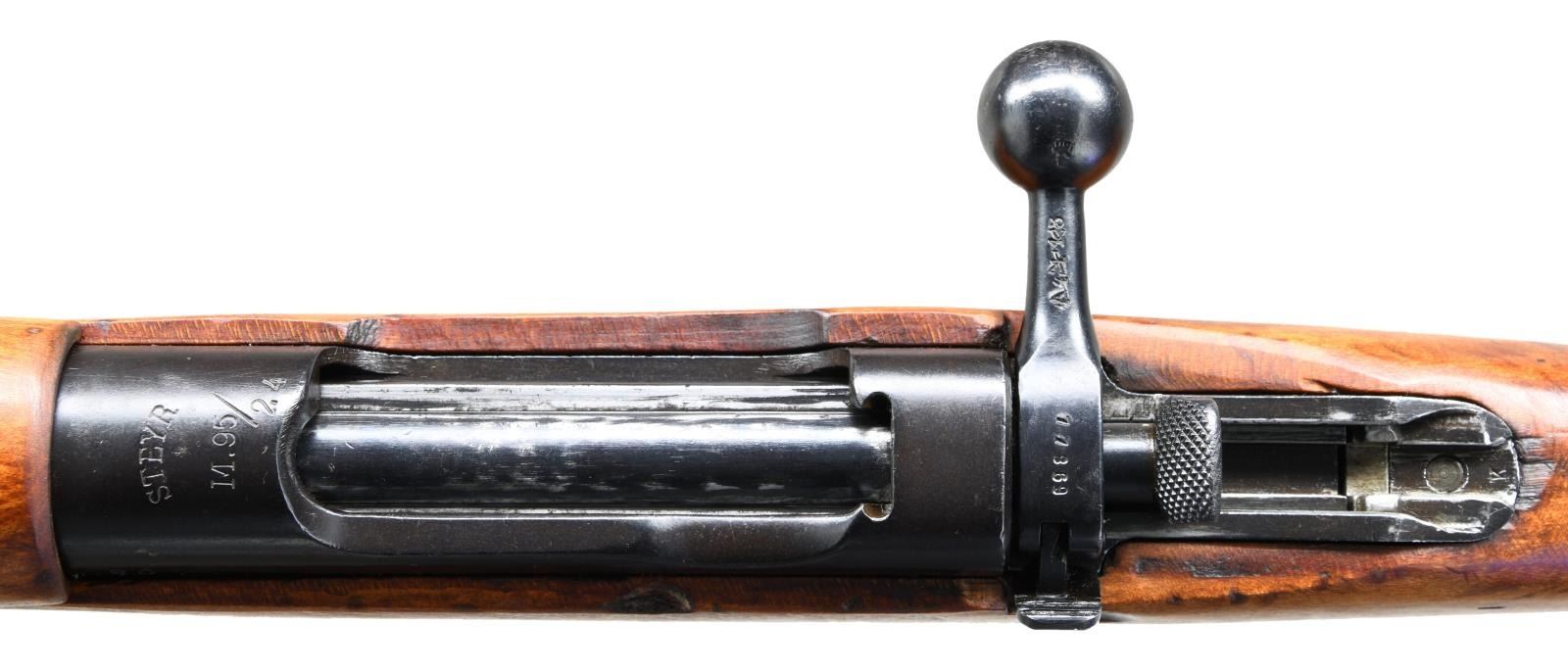 Cal. 8mm Mauser. S# 80. Bbl. 24". Interwar Yugo conversion of a Steyr M95 to 8mm Mauser short rifle. Internal clip & extractor are both present. Matching numbers on floorplate & trigger guard. Other parts are mismatched. Top of receiver is marked "STEYR" & "M.95/24". Tangent rear sight graduated to 2000m. Blade front sight. European hardwood stock set w/ bottom mounted sling swivels. bottom of wrist has faint WW2 German depot stamp. CONDITION: refinished stock set w/ added finish, scattered dings & handling marks. Metal retains 60% dull reblue w/ some cleaning scratches on left side of mag body, overall fading & scattered oxidation. Very good bore. (23-1918/MJC). CURIO. $200-400.