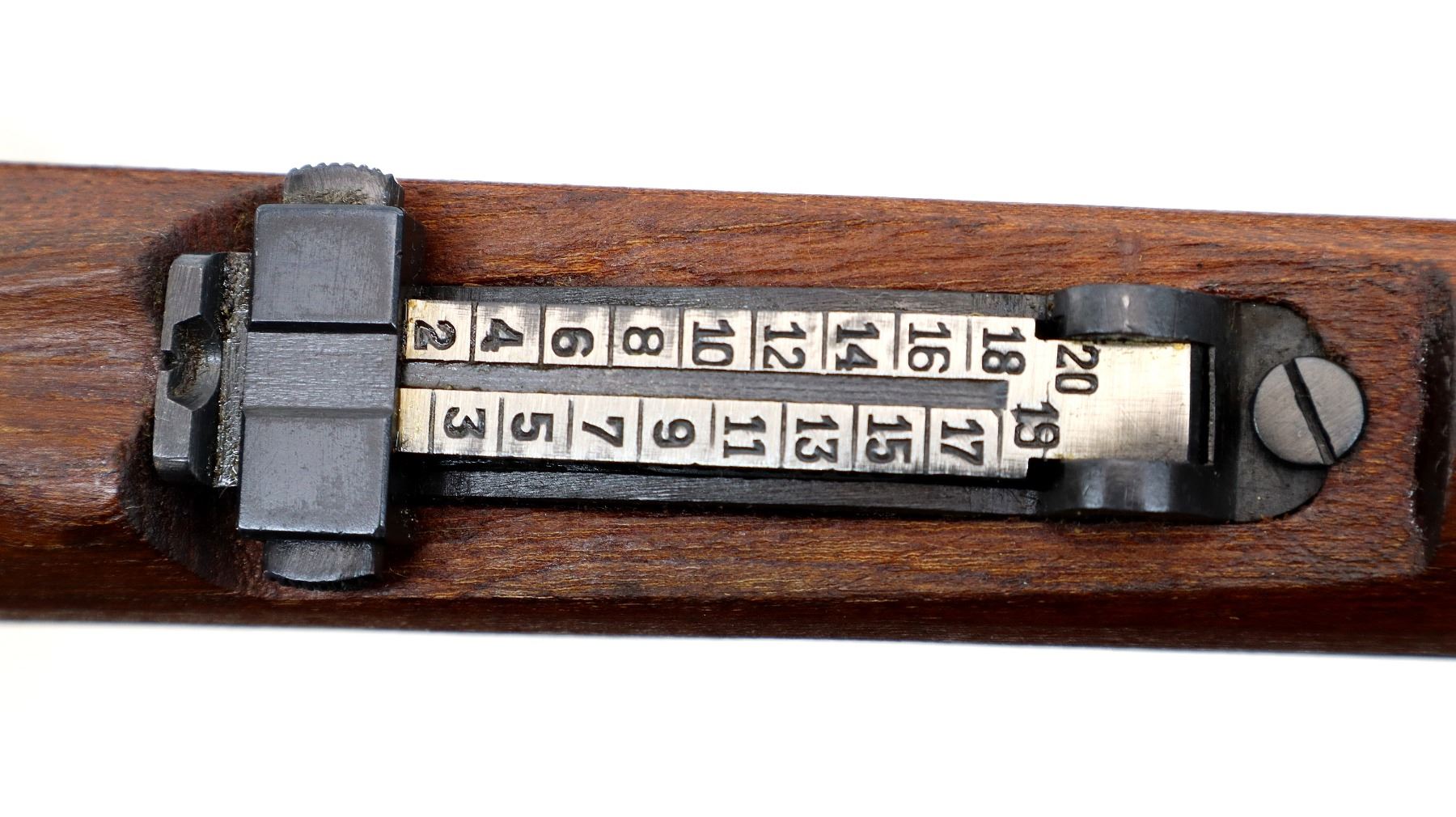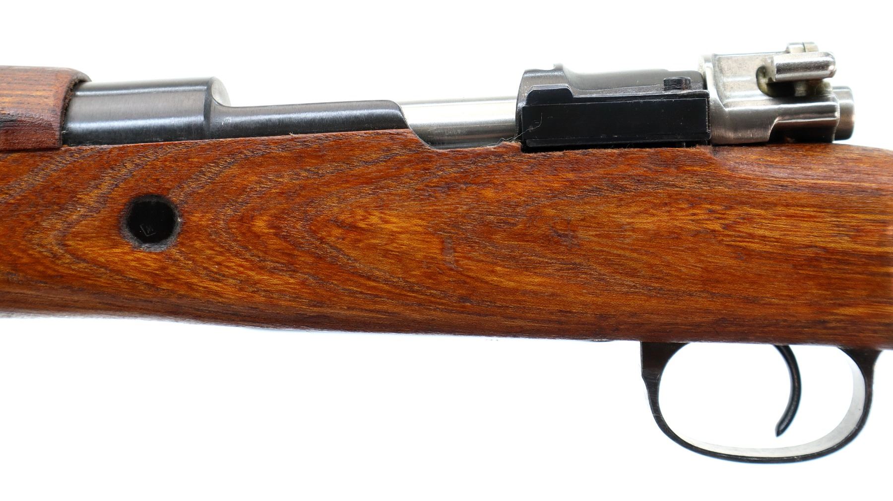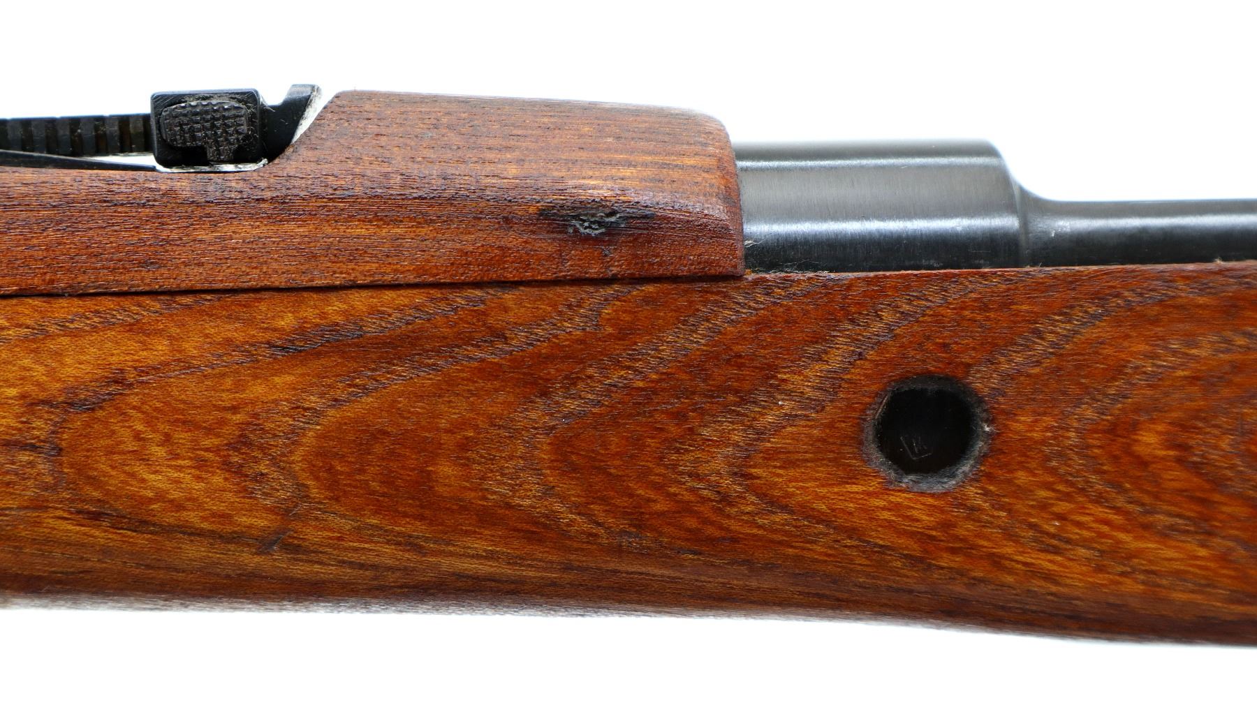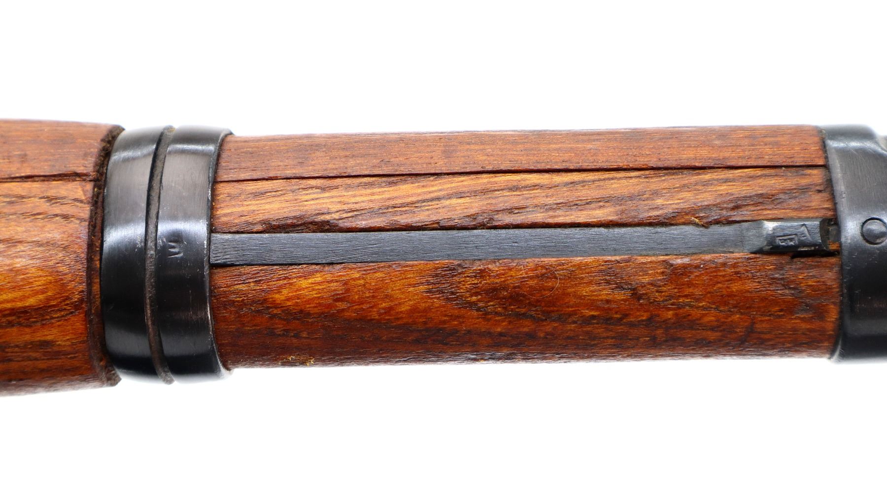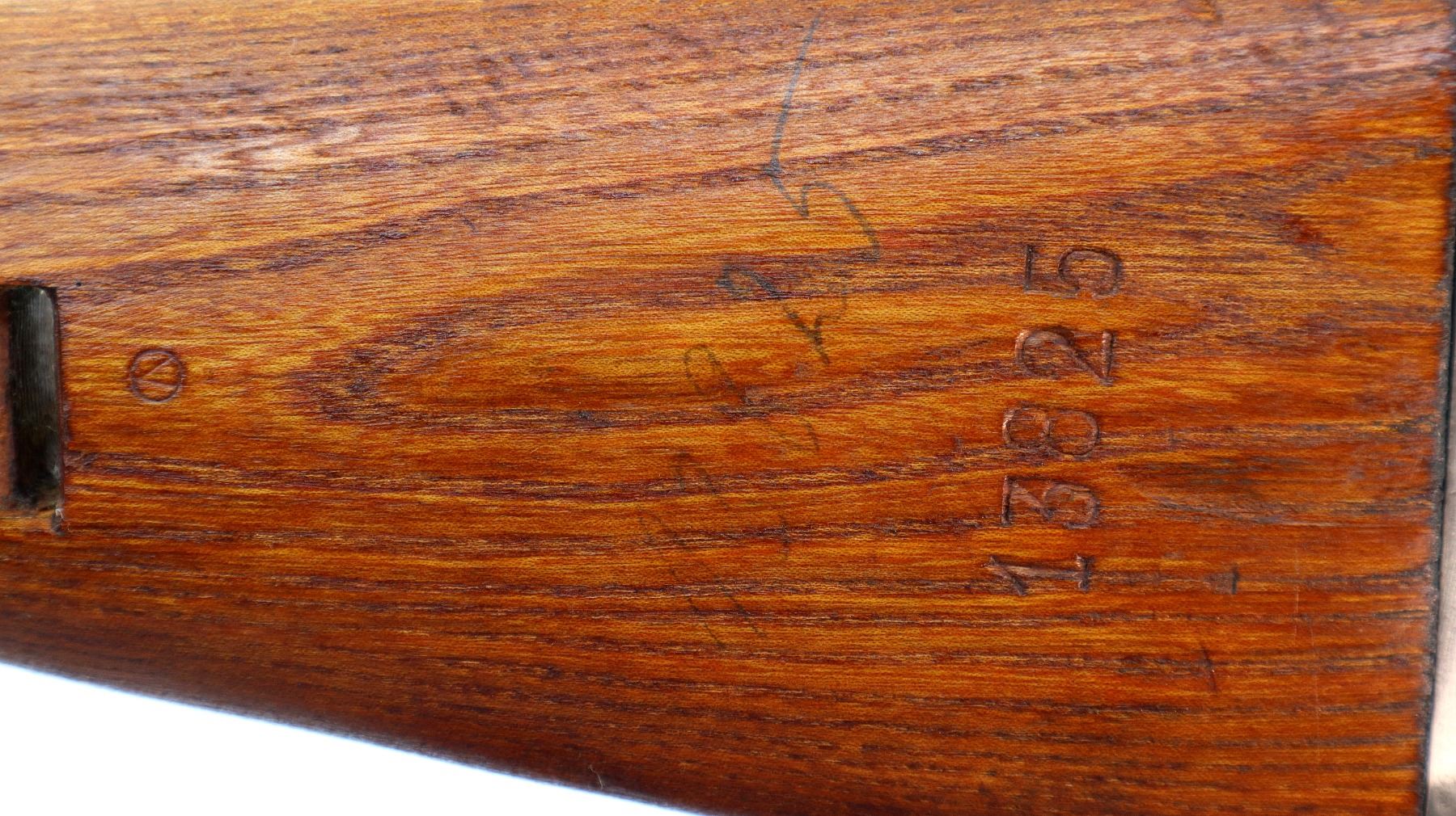 Main Description: Visible numbers match. Barley corn front sight with hood and ramp, adjustable u notched rear sight, blued finish, unmarked receiver ring, BO stands for Bez Oznake meaning unmarked or without markings. Silver bolt with turned down handle and flat bottomed knob. Two piece full military wood stocks, pistol grip, smooth cupped steel butt plate, rear slot front swivel, cleaning rod, bayonet lug.