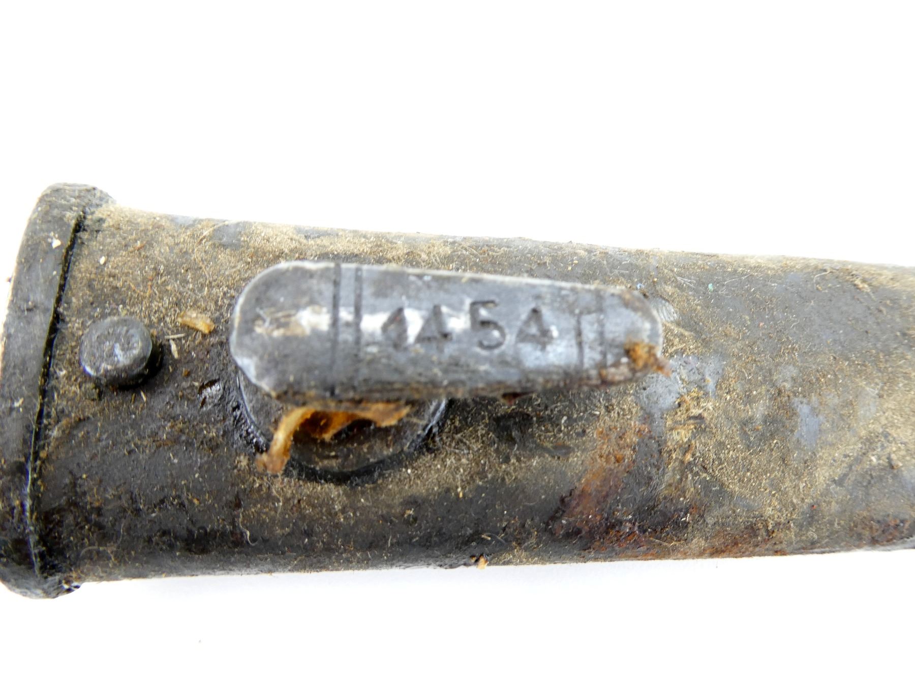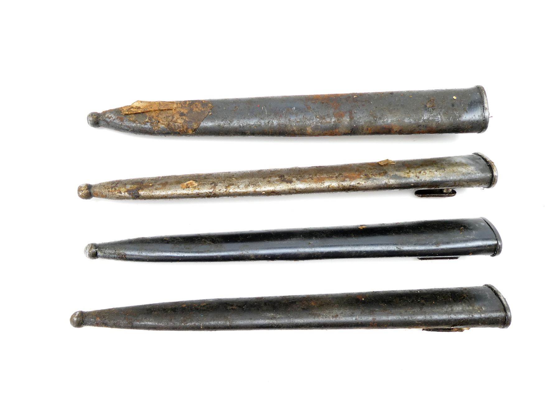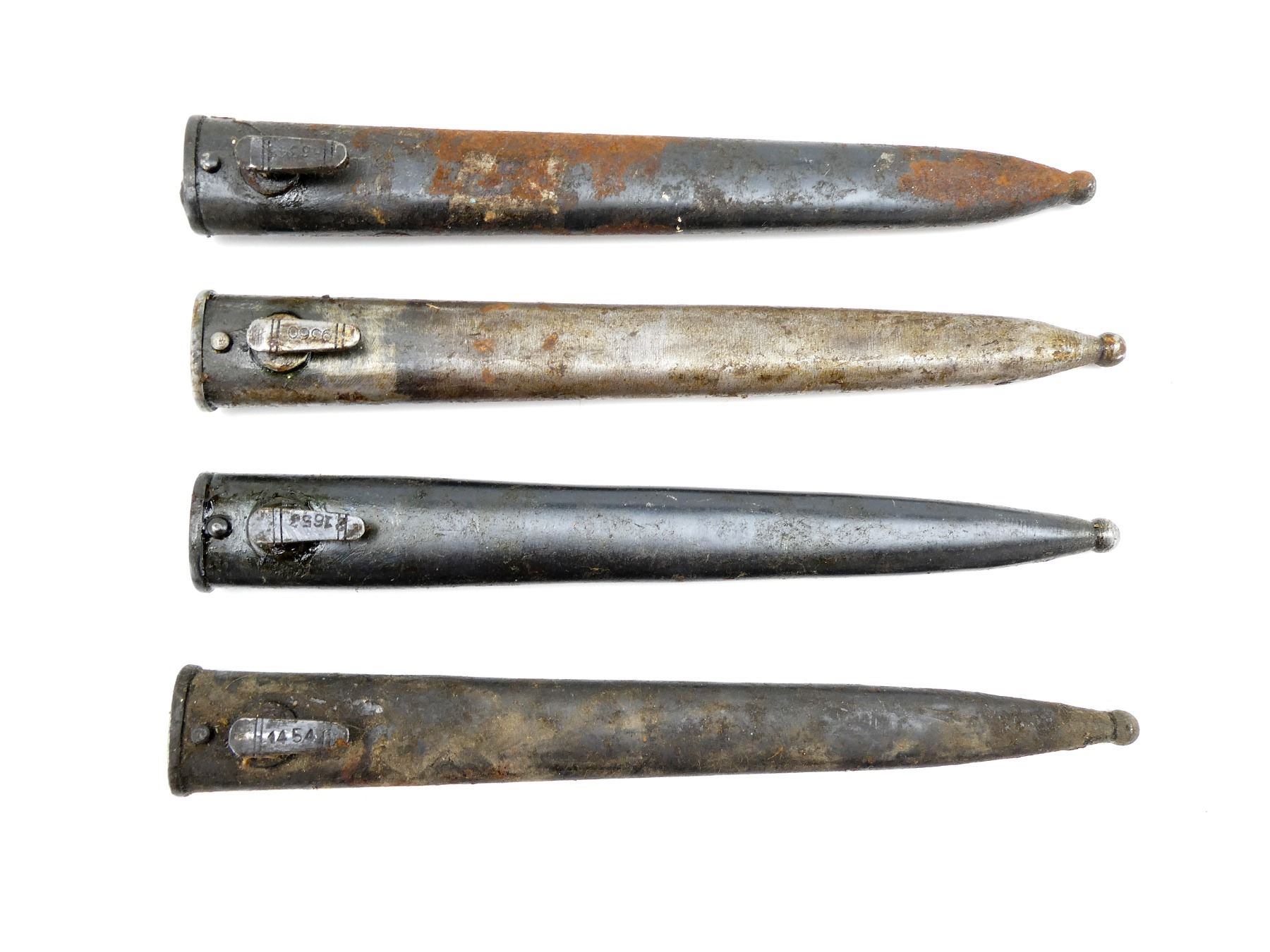 LOT INCLUDES; (4) STEEL SCABBARDS (NO BAYONETS), STUDS MARKED: "66343", "21653", "1454", "9360", ONE WITH PROOF MARK UNDER THROAT, ALL SHOW AGE / WEAR / TEAR, OALS APPROX. 10 3/8 TO 10 5/8". SEE PHOTOS. *COVERED IN GREASE*