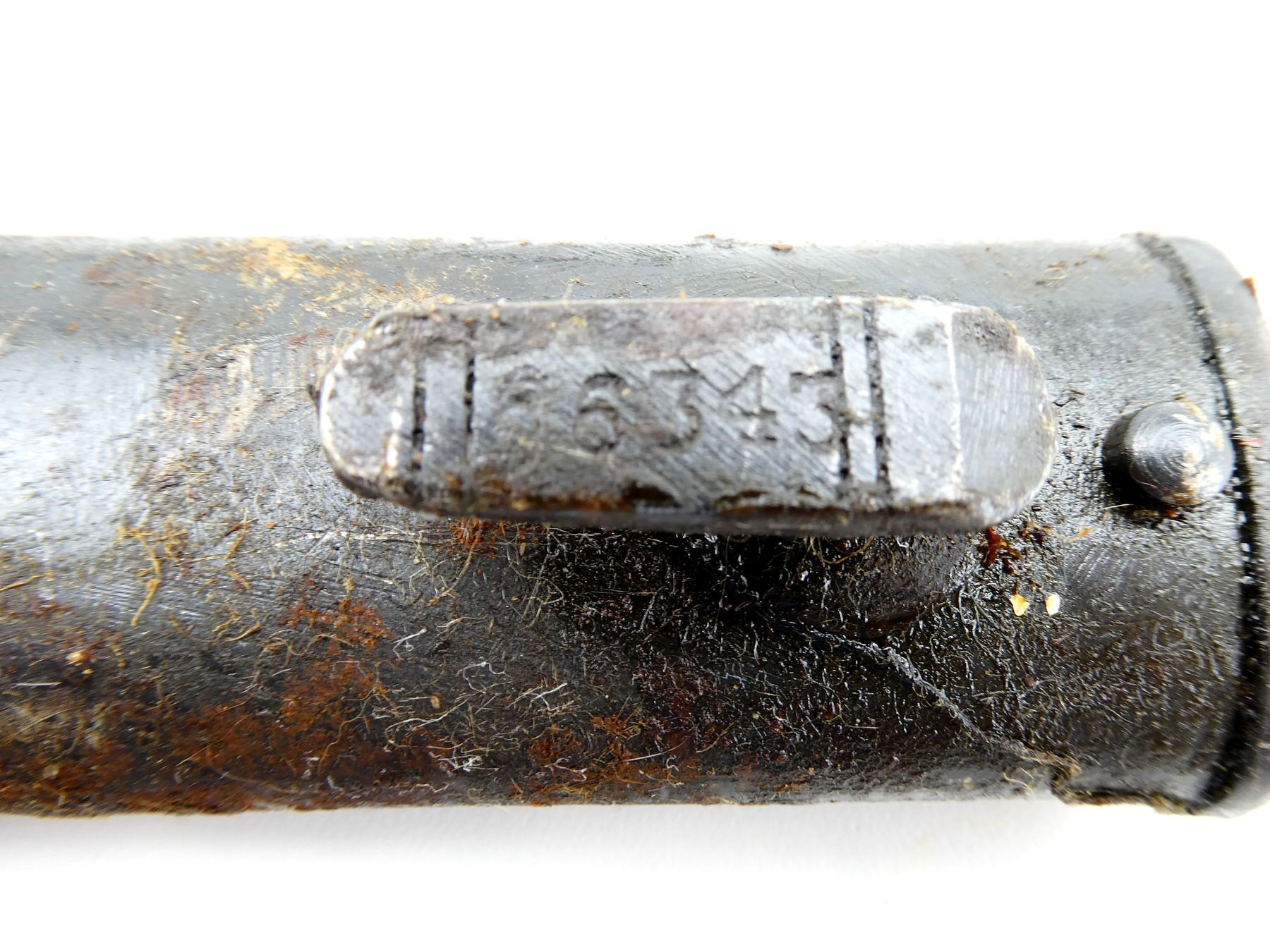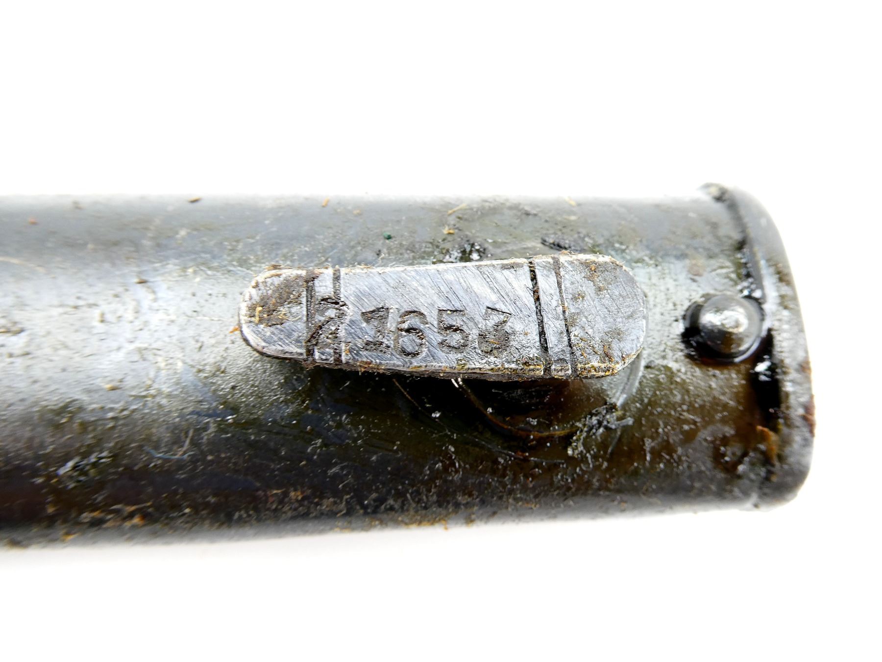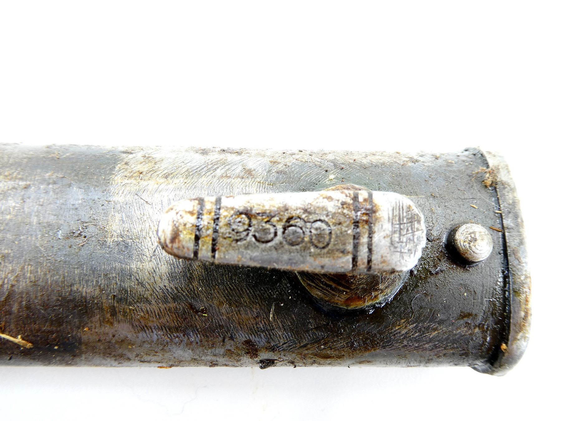 LOT INCLUDES; (4) STEEL SCABBARDS (NO BAYONETS), STUDS MARKED: "66343", "21653", "1454", "9360", ONE WITH PROOF MARK UNDER THROAT, ALL SHOW AGE / WEAR / TEAR, OALS APPROX. 10 3/8 TO 10 5/8". SEE PHOTOS. *COVERED IN GREASE*