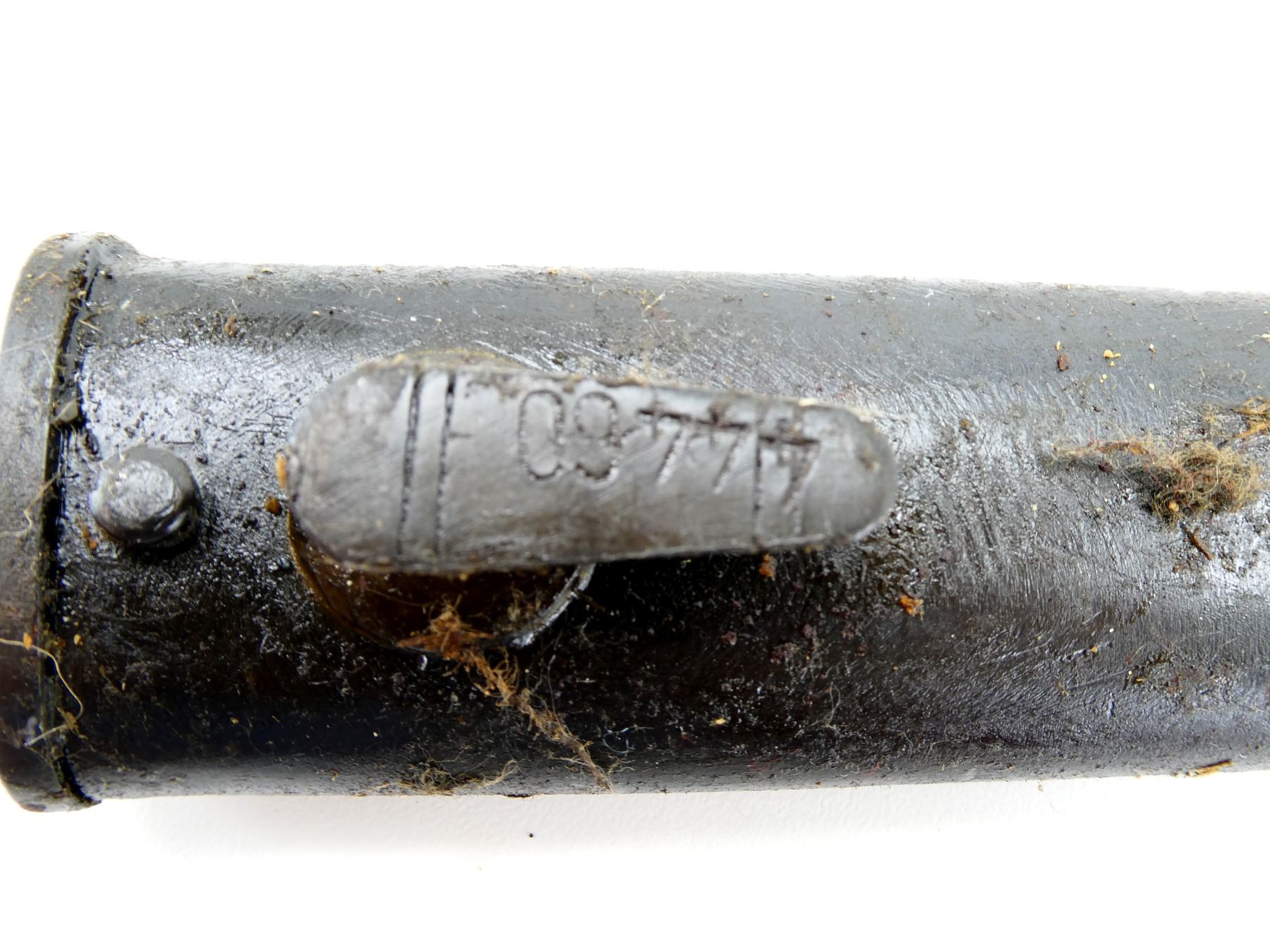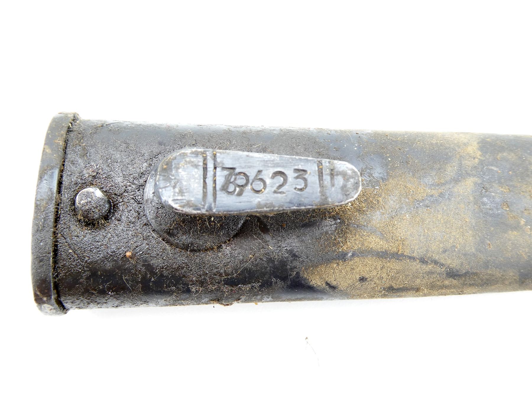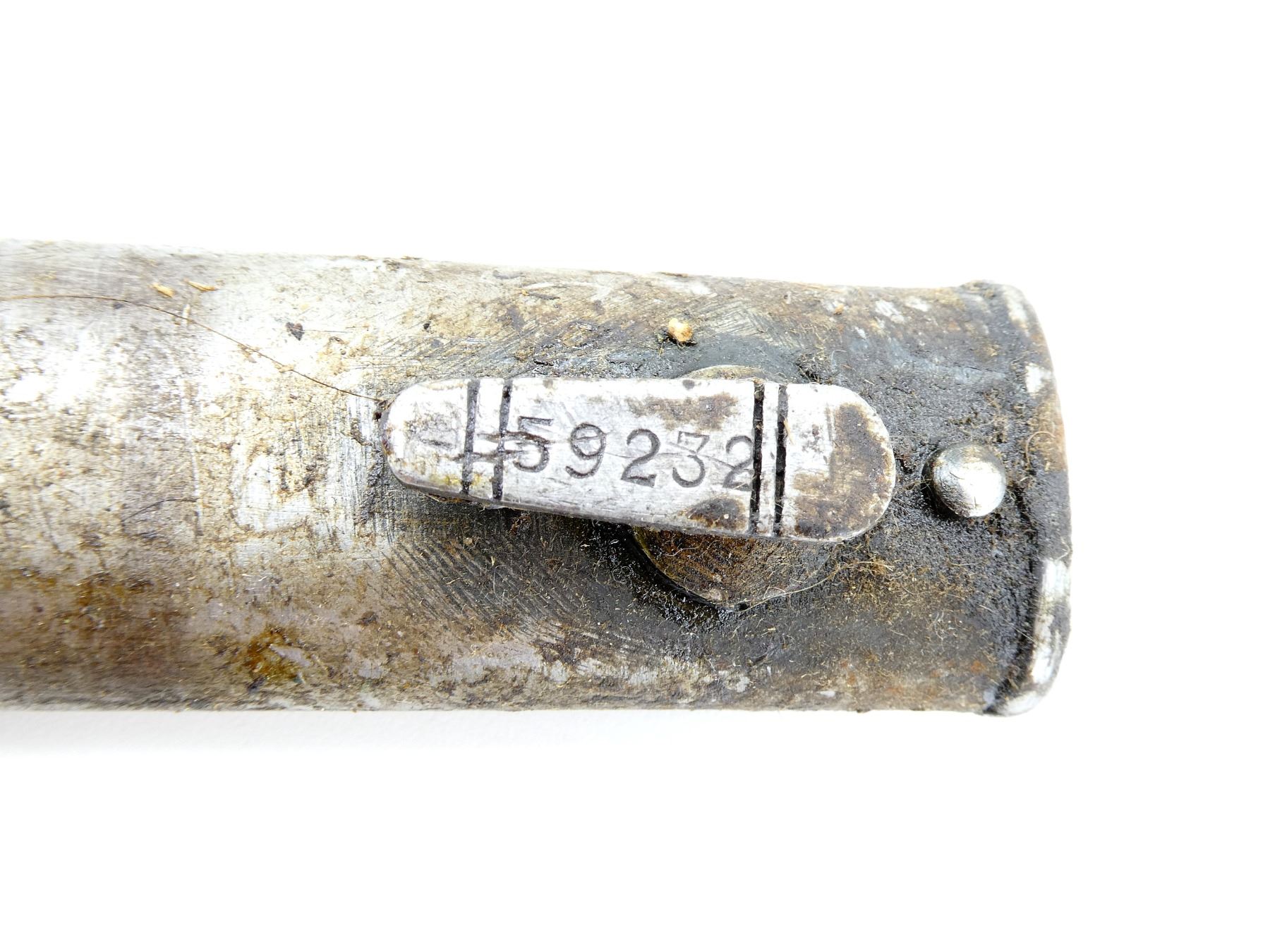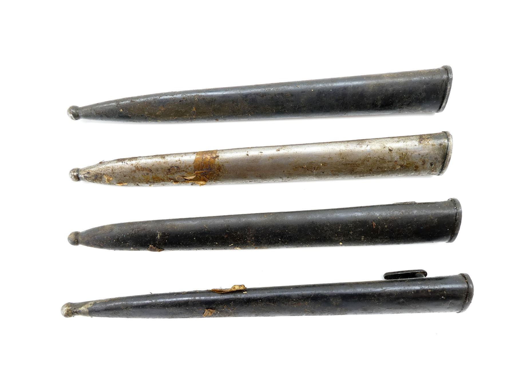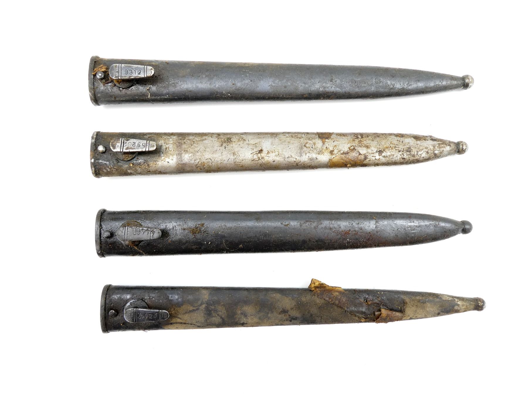 LOT INCLUDES; (4) STEEL SCABBARDS (NO BAYONETS), STUDS MARKED: "76923", "59232", "44460", "9312", TWO WITH PROOF MARK UNDER THROAT, ALL SHOW AGE / WEAR / TEAR, OALS APPROX. 10 3/8 TO 10 5/8". SEE PHOTOS. *COVERED IN GREASE*
