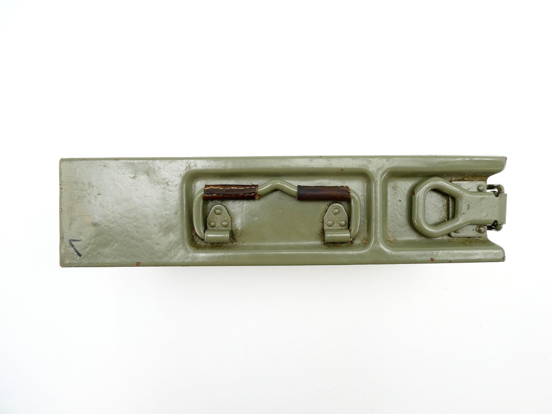 (1) FITS 8MM MG BELTS, IN APPLE GREEN STEEL AMMO TIN, FAINT PROOF MARK ON LID & SIDE OF TIN, INCLUDES BELT LOADER, HOPPER, HANDLE AND CLAMP, VARIOUS PROOF MARKS, TIN APPROX. 14.5" X 3.5" X 7". SEE PHOTOS.